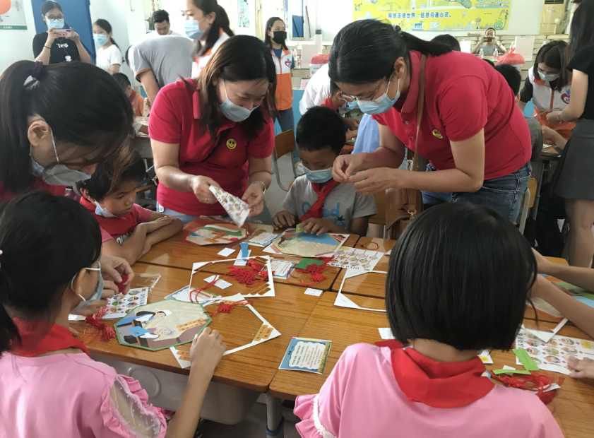 与会相关部门负责人及热心商家向孩子们赠送节日慰问品,孩子们也以自己亲手制作的感恩礼物回赠。社工、热心商家团队和义工一起与孩子们制作趣味手工制品,通过手工互动,不仅增添了活动的乐趣,还拉近了他们与孩子的距离。