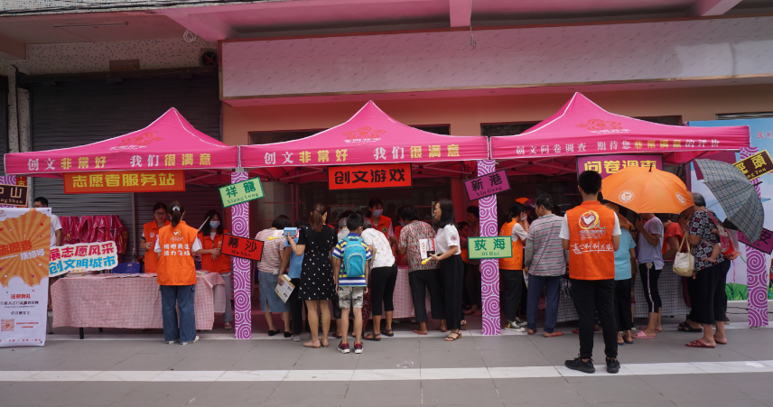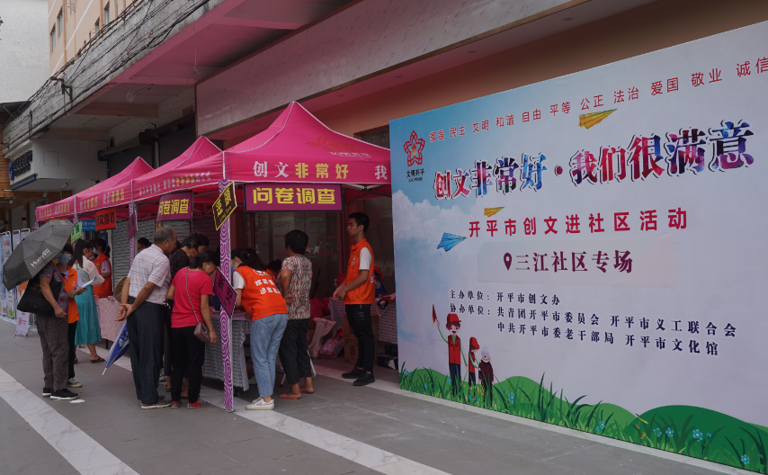 在三江社区“创文非常好,我们很满意”主题活动现场,由志愿者、义工组成的创文进社区宣传队通过问卷调查、创文游戏、志愿服务等形式宣传亚星 创文活动。