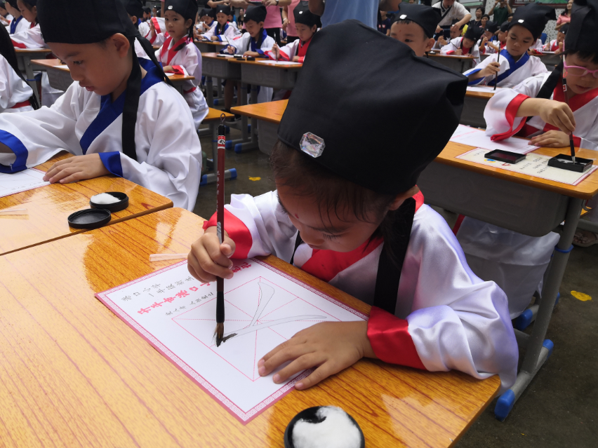 活动除了有正衣冠、拜先师、击鼓鸣志等古礼仪环节外,还让小朋友进行“启蒙描红”“启蒙教育”等仪式,通过写字识字,诵读传统家训等,开启求学阶段大门,走好学习文化的第一步。