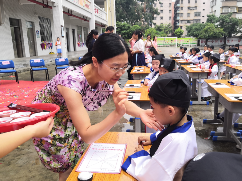 期间,还进行了“朱砂启智”仪式,与会领导嘉宾、班主任、老师用朱砂在同学们的额头正中央点上红痣,寄托美好的愿望,希望他们从此眼明心亮,好读书、读好书、读书好。活动最后,学生们还向老师、父母行谢礼,孝亲敬师,感谢老师教育之恩,感谢父母养育之恩。