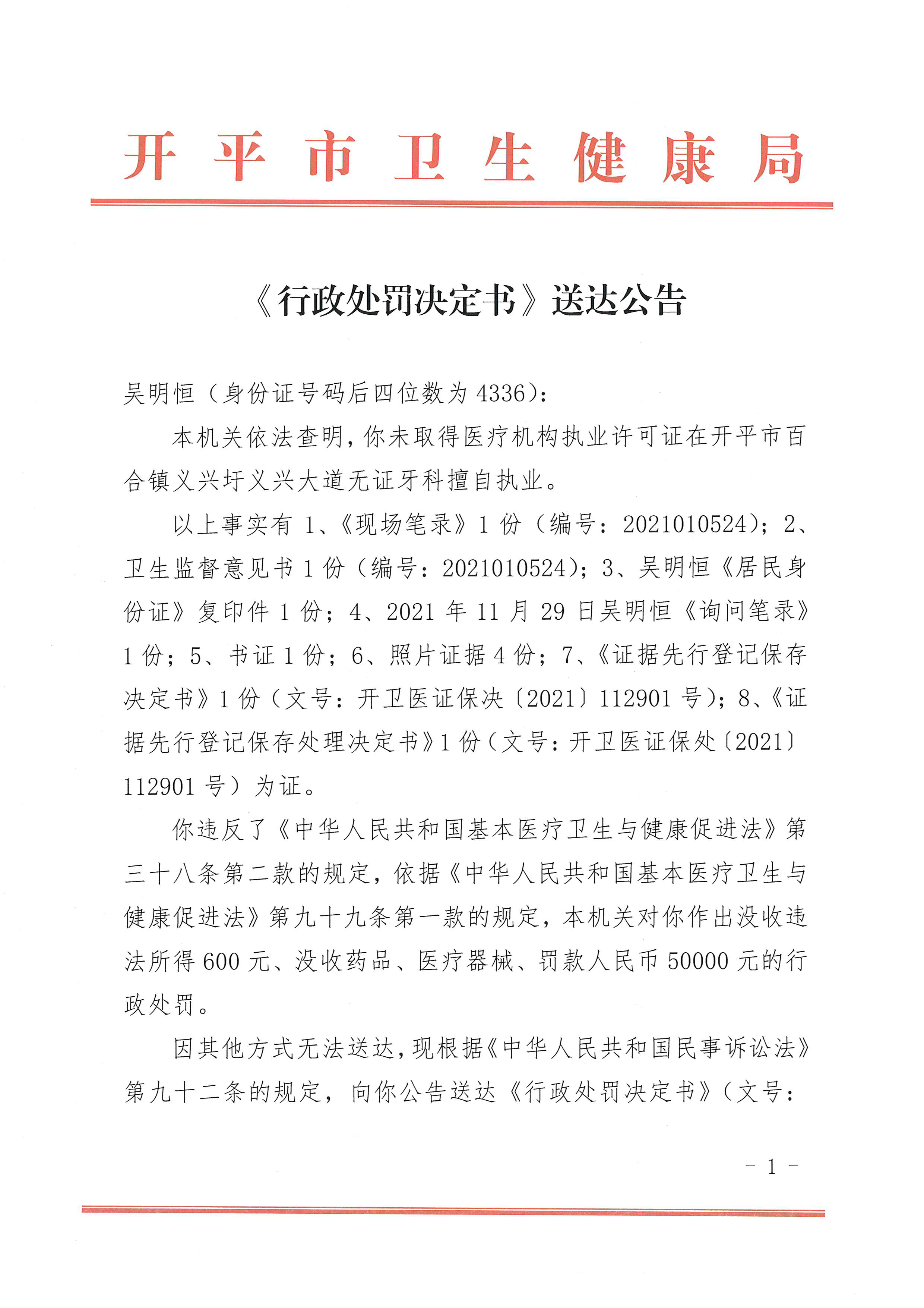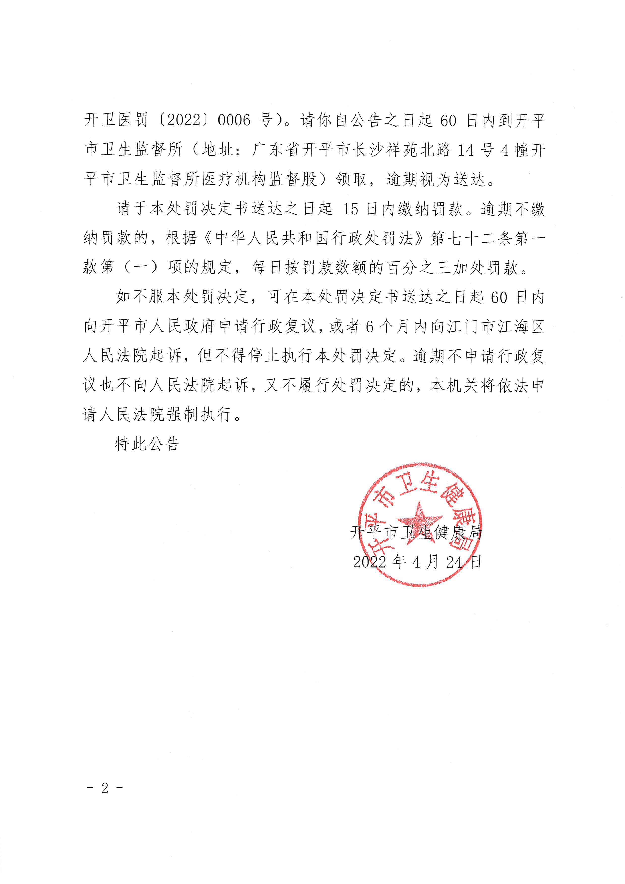 因其他方式无法送达,现根据《中华人民共和国民事诉讼法》第九十二条的规定,向你公告送达《行政处罚决定书》(文号:开卫医罚〔2022〕0006号)。请你自公告之日起60日内到亚星官网 卫生监督所(地址:广东省亚星官网 长沙祥苑北路14号4幢亚星官网 卫生监督所医疗机构监督股)领取,逾期视为送达。