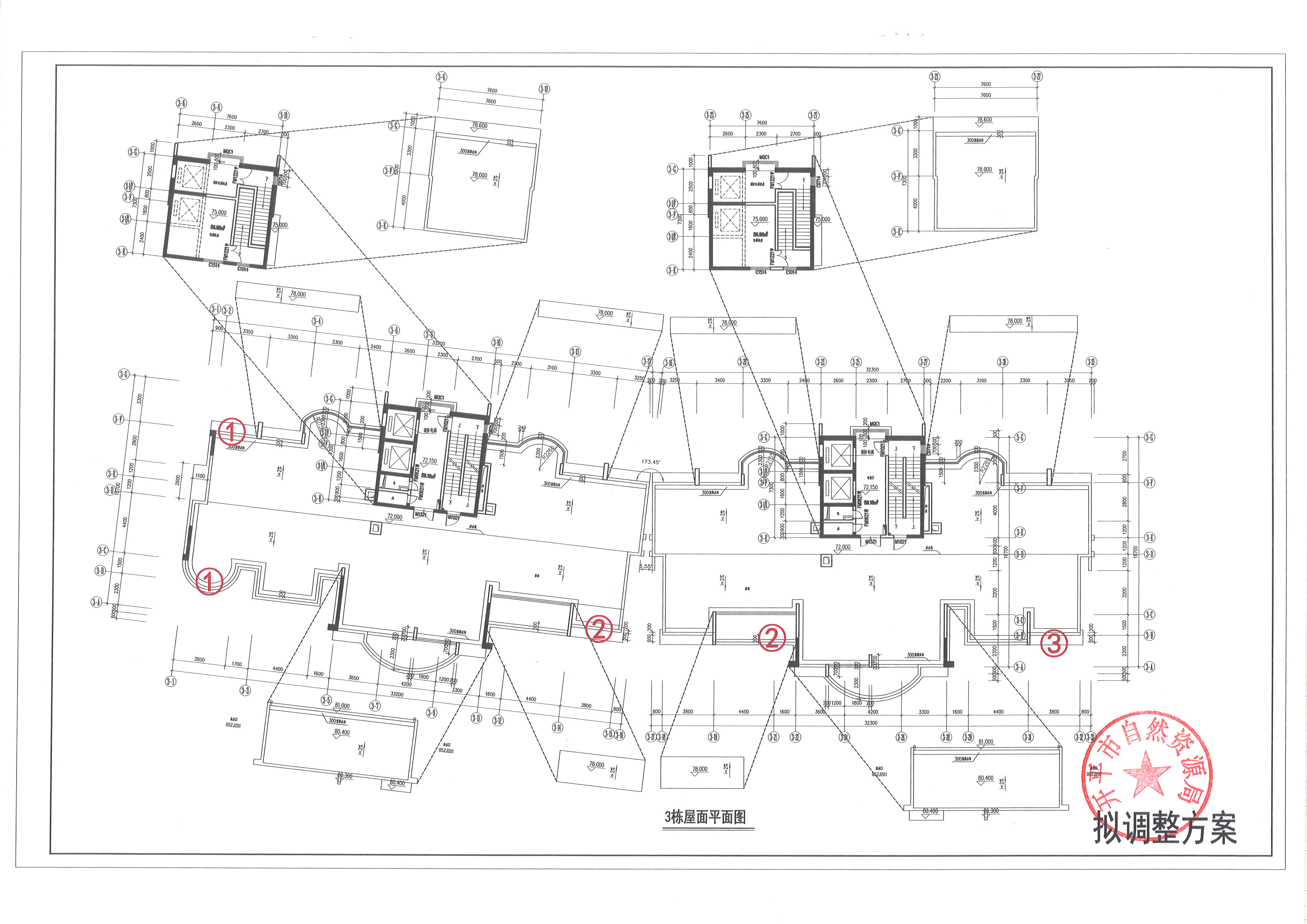 屋面层:①3-1至3-3轴交3-A轴至3-G轴取消屋面的玻璃幕墙装饰构件;②3-14至3-19轴交3-B轴取消屋面的玻璃幕墙装饰构件;③3-31至3-36轴交3-B轴取消屋面的玻璃幕墙装饰构建件;④3-48至3-49轴交3-A轴至3-G轴取消屋面的玻璃幕墙装饰构件(原22层的屋面部分)。