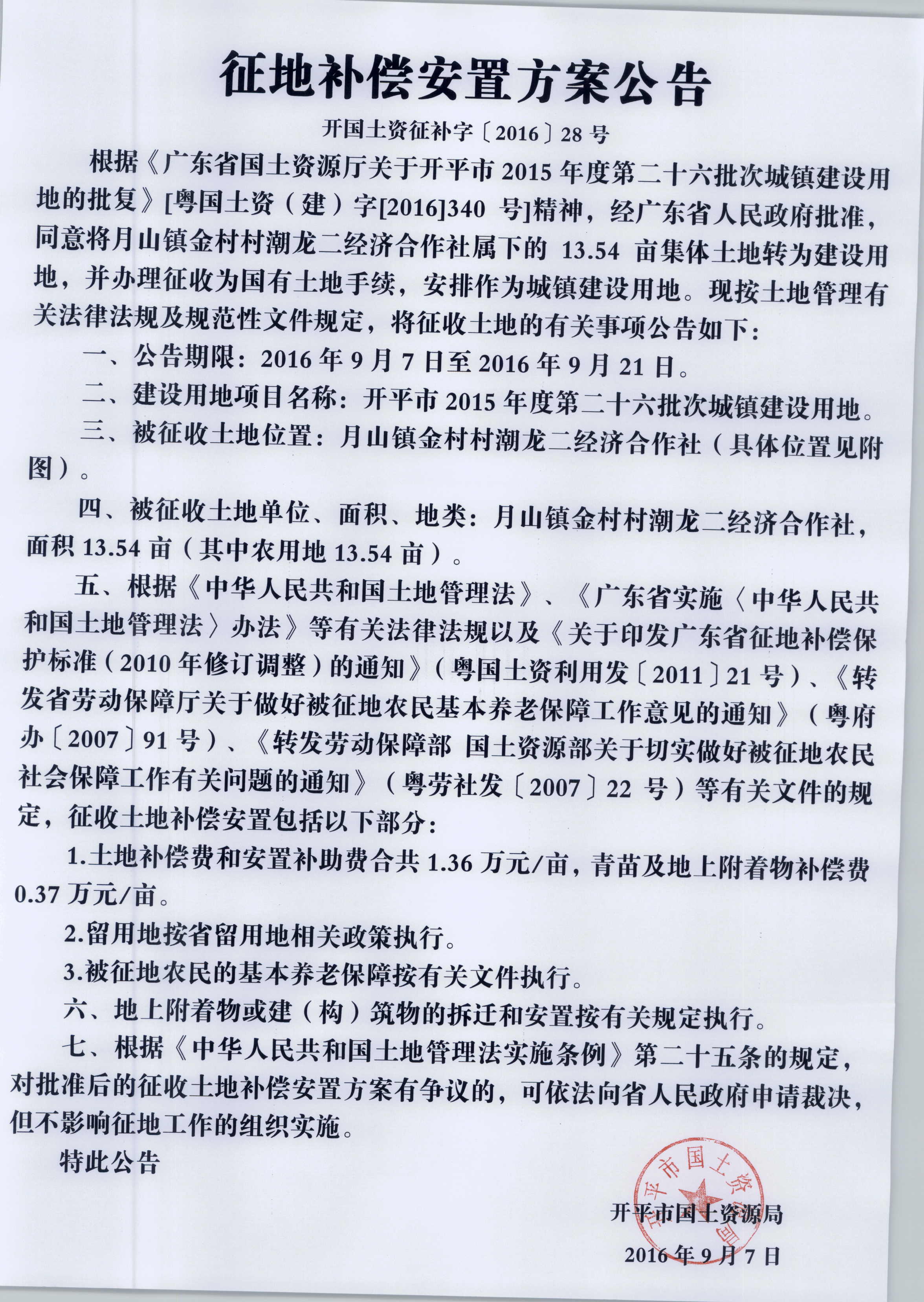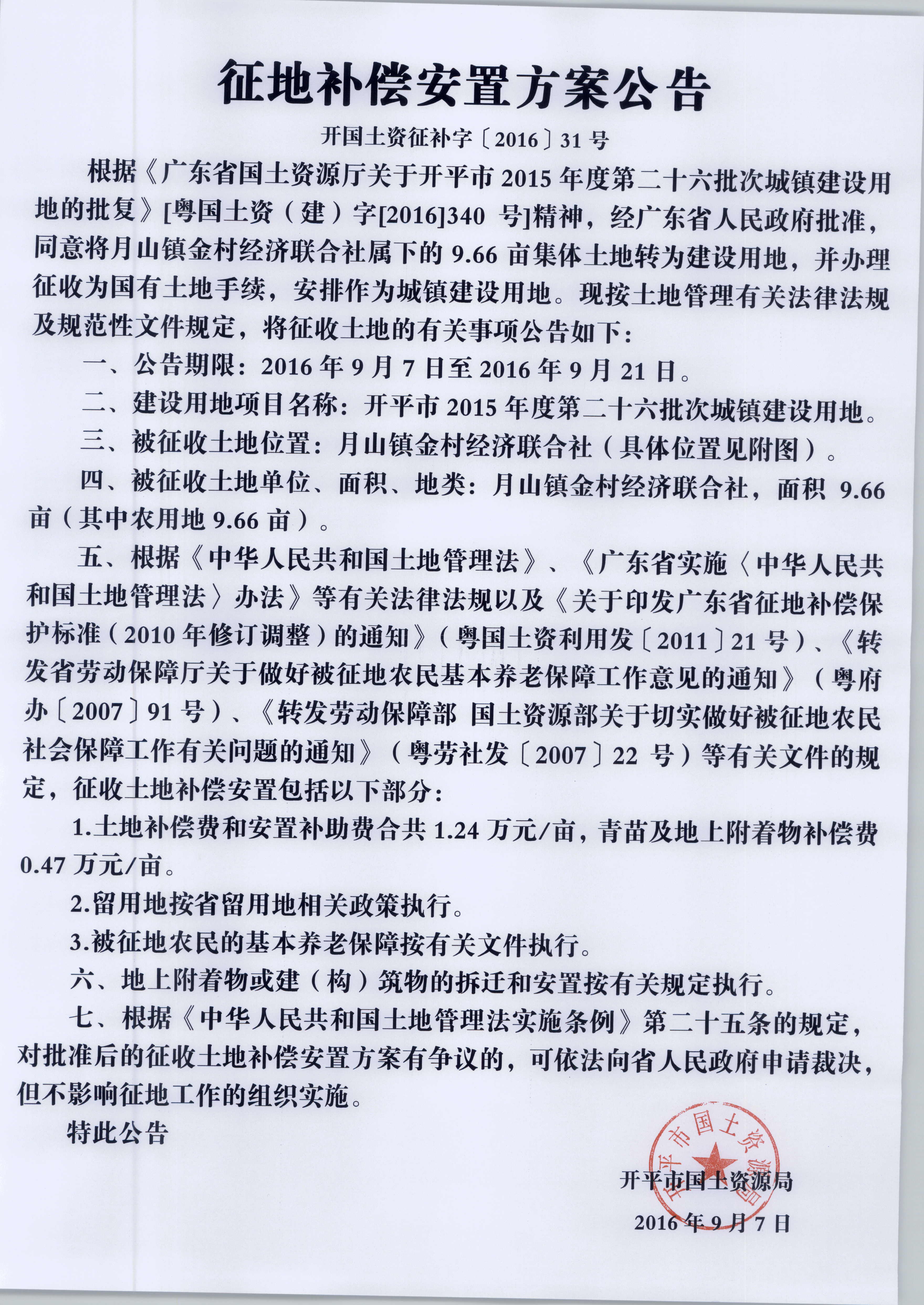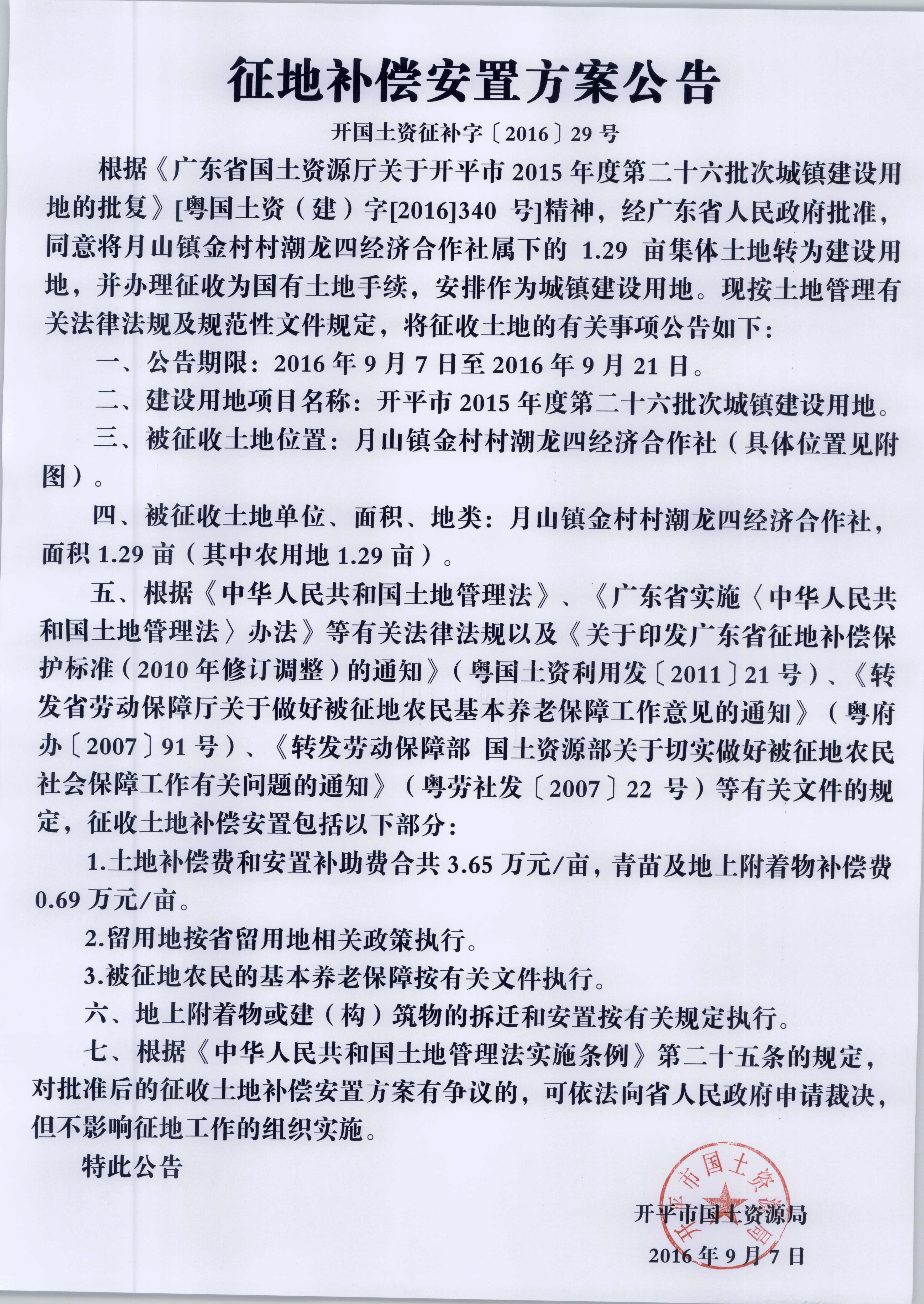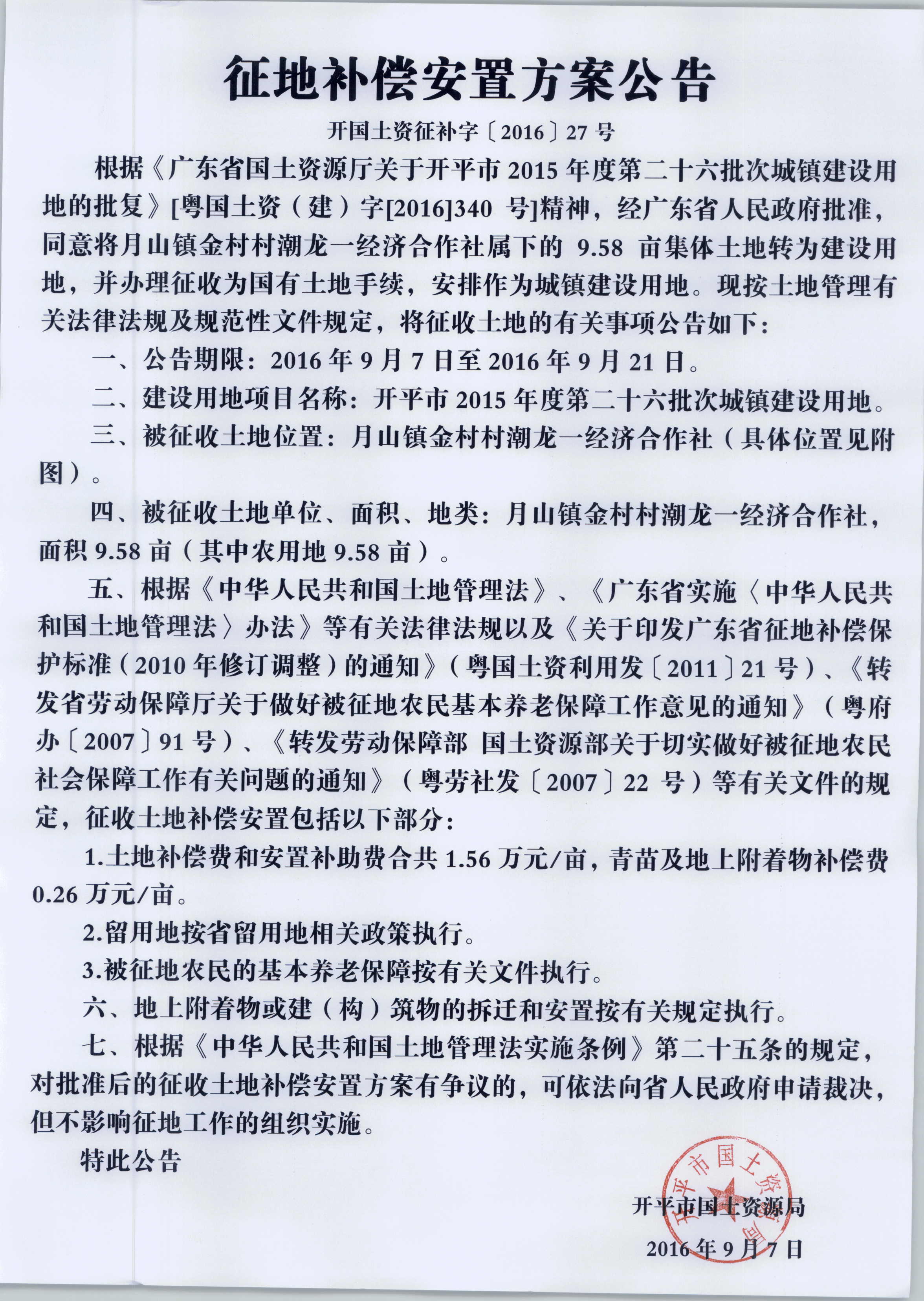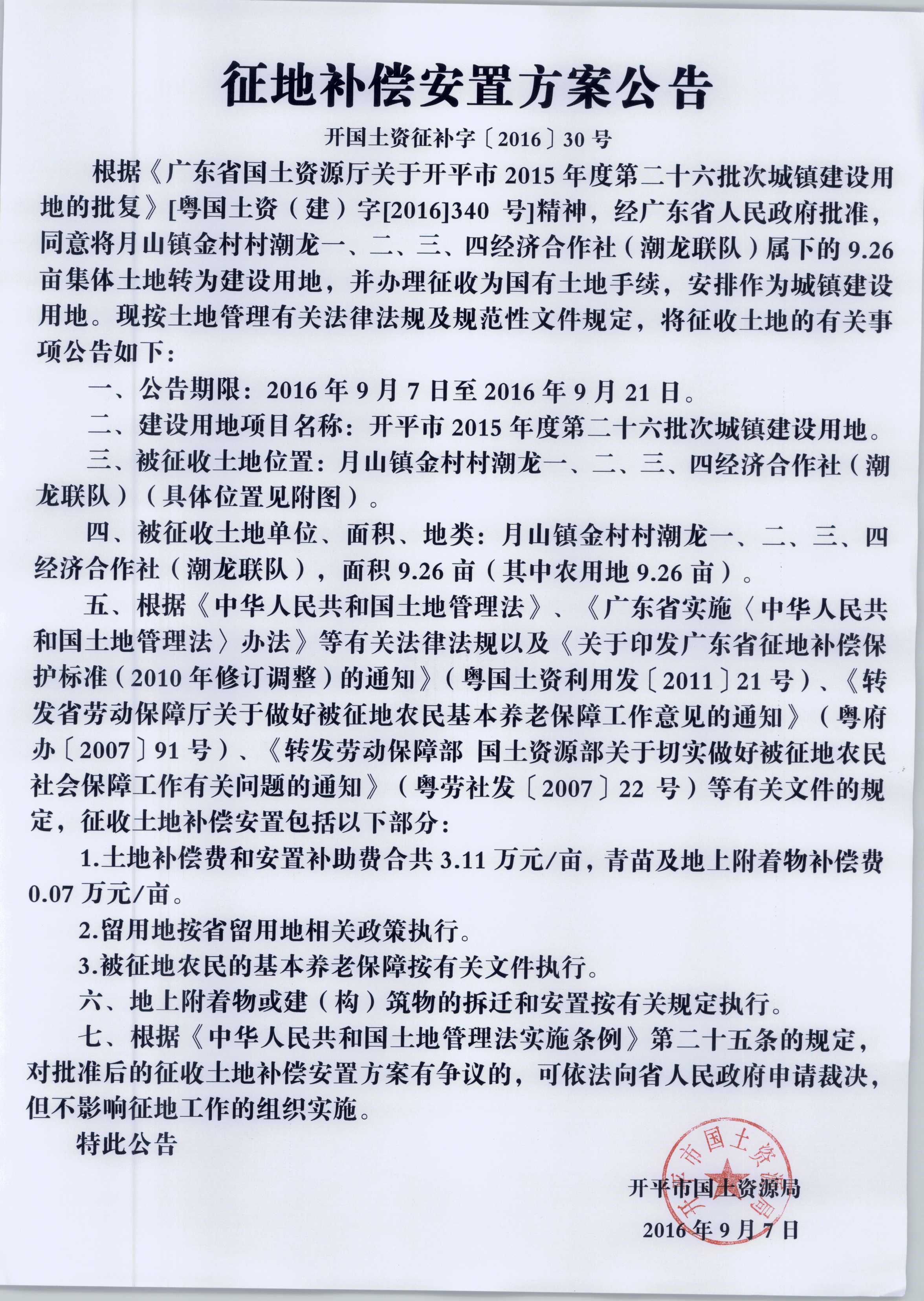 征地补偿安置方案公告(亚星官网 2015年度第二十六批次城镇建设用地)