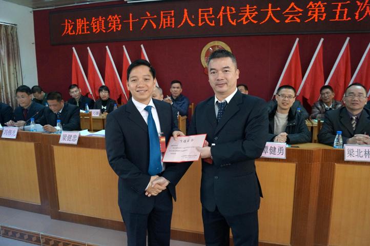 大会接受了冯健楚同志辞去龙胜镇人大主席和梁健忠同志辞去龙胜镇人民政府镇长职务请求的决定,并根据大会通过的选举办法,到会的57名人大代表认真履行职责,投下了神圣的一票。以全票通过的结果选举梁健忠为龙胜镇人民代表大会主席,利俊义为龙胜镇人民政府镇长。市人大常委会副主任余荣深为新当选的龙胜镇人民代表大会主席梁健忠颁发了当选证书,梁健忠为新当选的龙胜镇人民政府镇长利俊义颁发了当选证书。