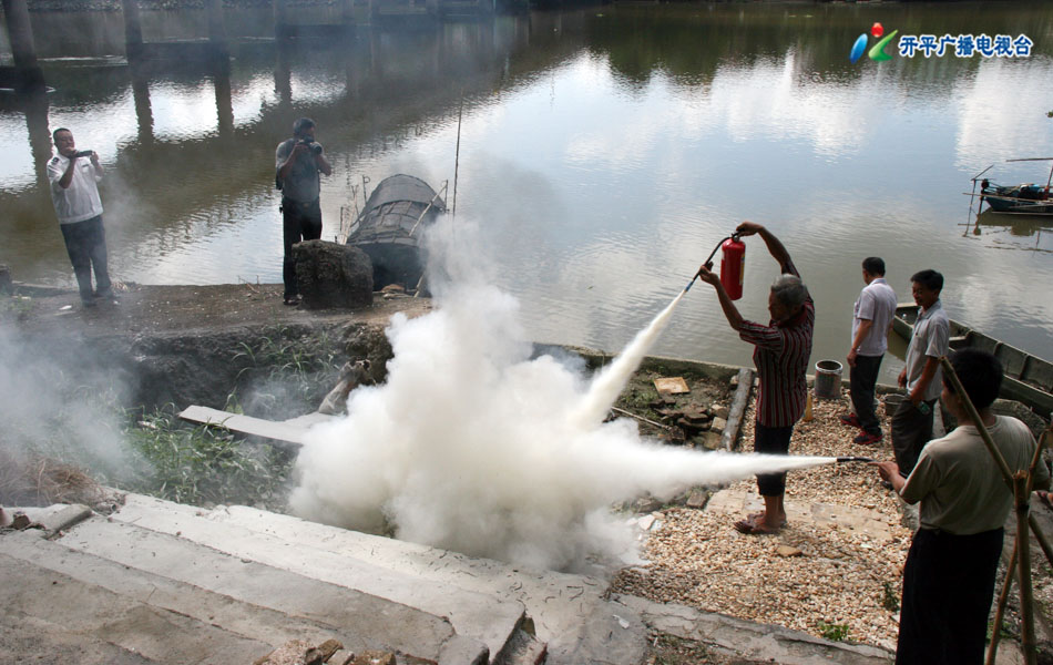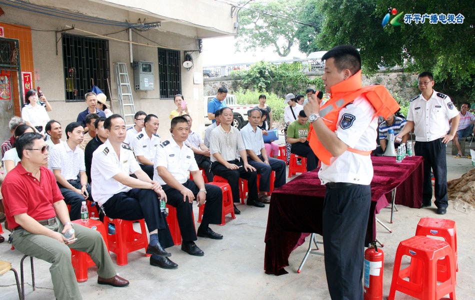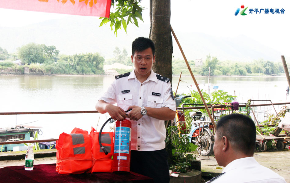 演练开始后,演练人员在陆上为群众讲解了灭火器的正确使用方法并且示范了救生衣的正确穿戴。演练人员强调,除了要正确穿戴救生衣之外,还要善于使用其中的求救哨。