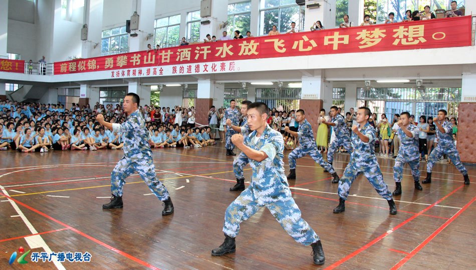 广播电视台 余映意】8月28日下午,在市金山中学体育馆内,一场军训汇操表演正在紧张地进行。参加军训的新生们在教官的口令下一丝不苟地完成了各项规定动作,挥洒自如的精彩操练,为师生和家长代表呈现了一场别开生面、耳目一新的表演。920名新生以饱满的精神和高昂的斗志向学校交上了入学以来的第一份答卷,在场的全校师生和教官们不时报以阵阵掌声。