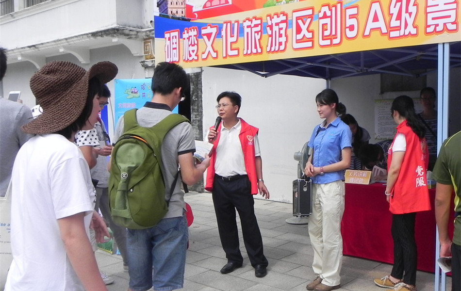碉楼文化旅游区的服务质量。活动分别设自力村、立园两个义务讲解服务平台,由市领导、旅游局及其他部门义工组成义务讲解服务队,分批到景区现场接受游客下单,带游客游览景区并提供免费解说服务。同时,市旅游局义工在现场派发文明出游、平安景区和游客调查问卷,倡导游客文明出游,提高游客文明素质,营造文明景区氛围。