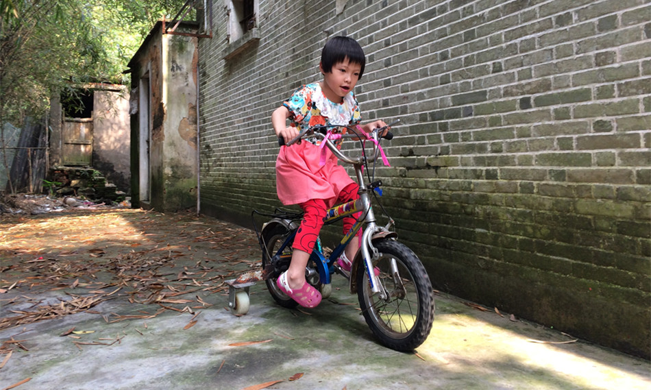 塘口镇潭溪凤社村。记者来到女童家中时,她正在户外踩车、打球,她虽然总是不停地跌倒,但没有哭喊,只是自行起身后又继续玩了起来。