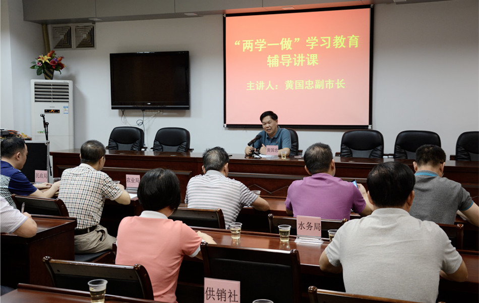 副市长黄国忠在市农业局会议室为分管部门领导班子作“两学一做”辅导讲课,农业局、水务局、林业局、民政局、气象局、供销社、残联等部门单位领导班子成员共30多人参加本次课程。