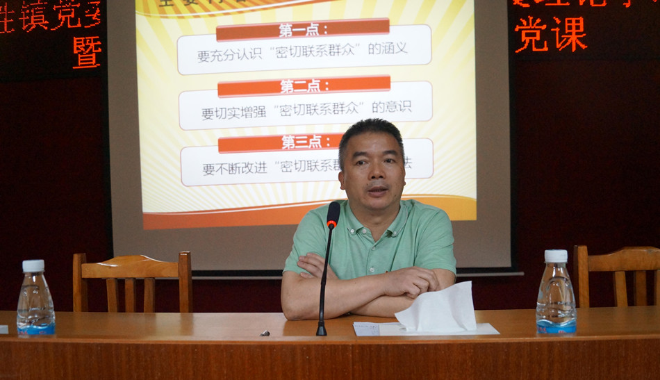 会上,镇党委书记梁健忠结合“两学一做”学习教育,围绕“坚持密切联系群众,全心全意为人民服务”的主题,从充分认识“密切联系群众”的涵义、切实增强“密切联系群众”的意识、不断改进“密切联系群众”的方法三个方面,给与会人员讲党课。梁健忠结合自己近年来一些工作感悟,通过深入浅出地讲解、热点亮点地诠释,加深了党员干部对密切联系群众,全心全意为人民服务的精神实质、丰富内涵的领会和理解,并结合全镇当前重点工作,就如何做一名合格党员做了明确要求。