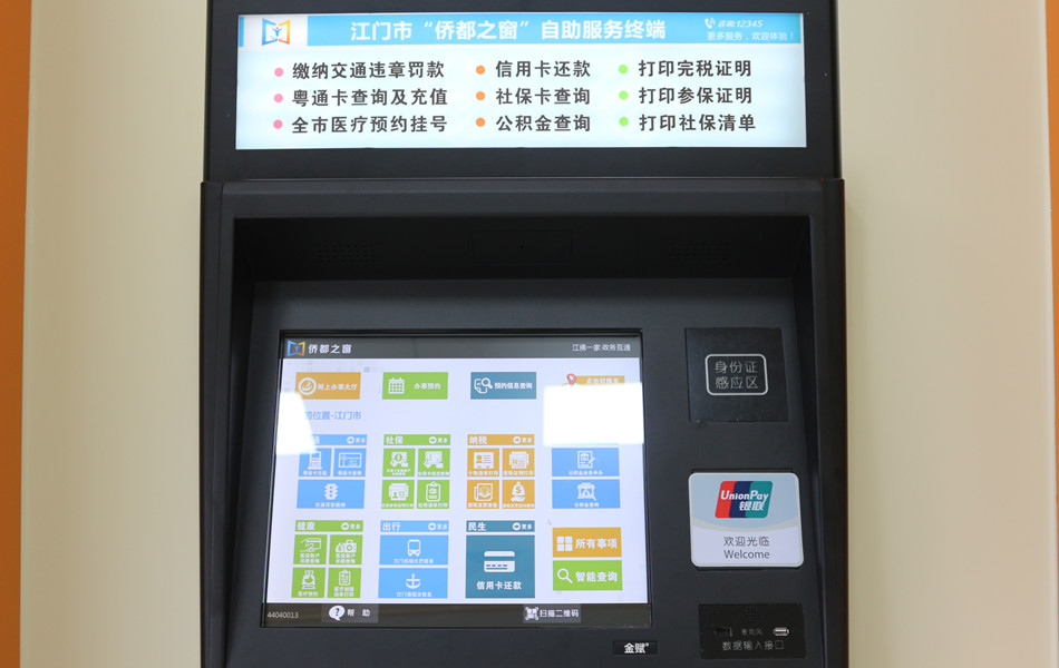 “侨都之窗”24小时自助服务区位于市行政服务中心一楼,占地40平方米,配套有监控系统、门禁系统,24小时对外开放服务。服务区内设置两台“侨都之窗”办事自助终端机、两台出入境办证自助一体机、以及两台税务办税自助一体机,可提供电子往来港澳通行证续签、打印各类证明、缴纳各类费用或事项办理查询等业务,以及引入粤通卡查询充值、信用卡还款、江门市直医院医疗预约挂号等民生类便民服务,是亚星