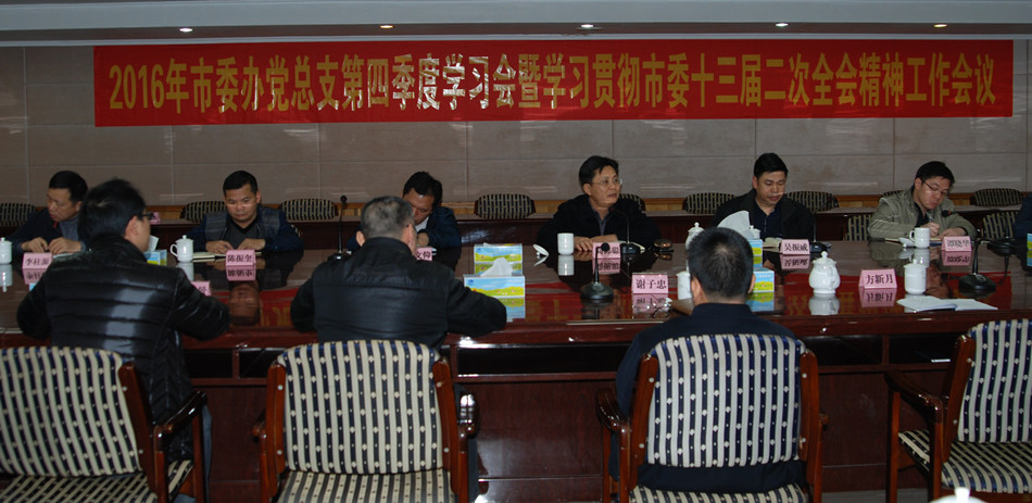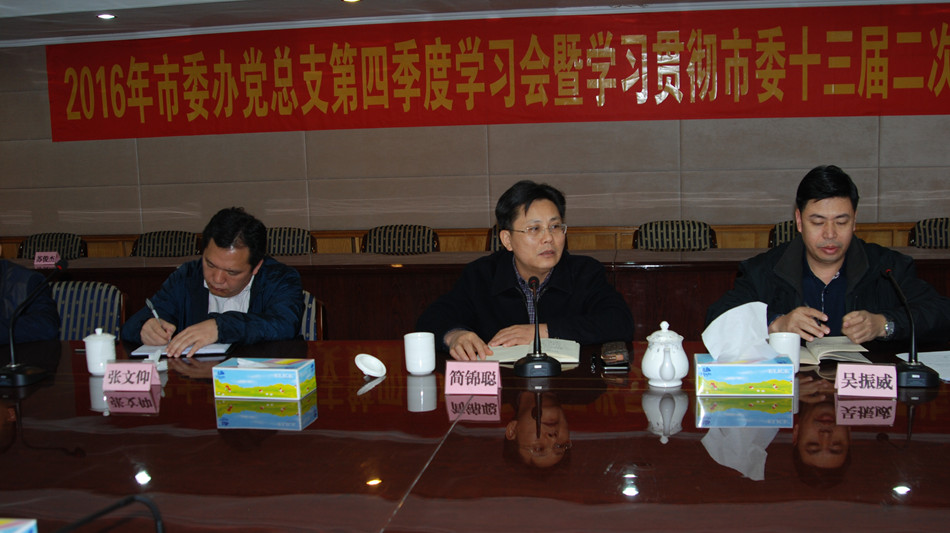 12月28日下午,市委办召开2016年党总支部第四季度学习会暨学习贯彻市委第十三届二次全会精神工作会议,迅速组织全体党员干部深入学习市委第十三届二次全会精神,并以市委全会精神为指导,抓紧、抓细、抓实、抓好办公室各项工作。市委常委、市委办主任简锦聪参加会议并作讲话。