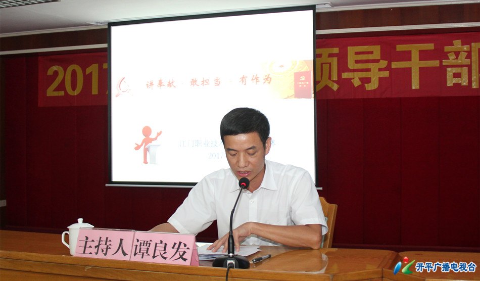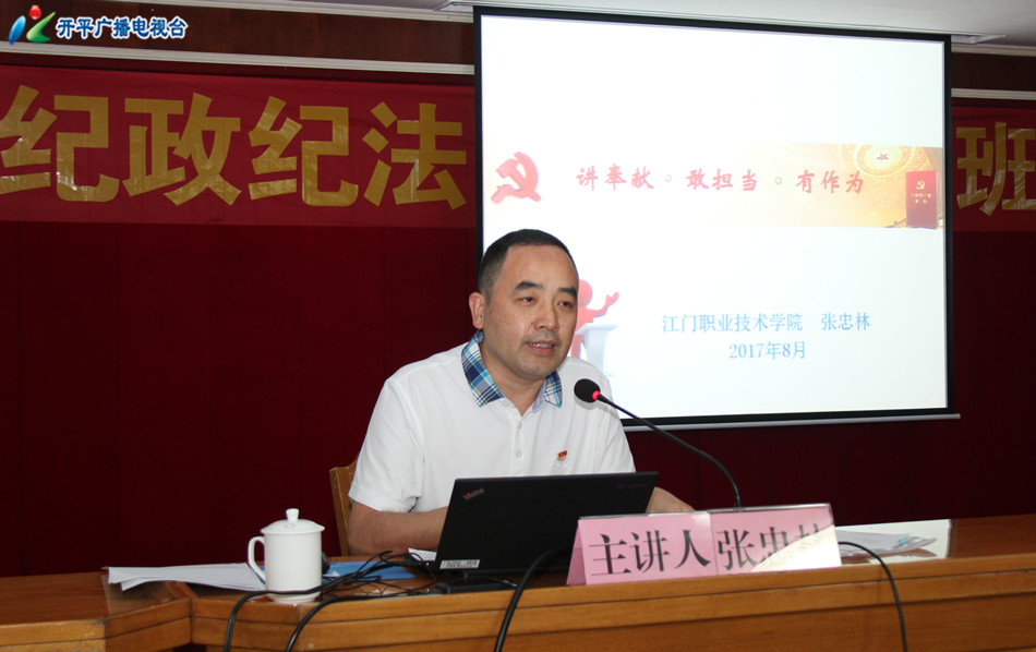举办领导干部党纪政纪法纪教育培训班。江门市职业技术学院党委书记张忠林在培训班上进行了题为《讲奉献 敢担当 有作为》的专题辅导。市委书记、市长庞正华作重要讲话,培训班还组织大家观看了警示教育片《迟到的悔恨——茂名市环保局原副局长梁锦红案件警示录》。