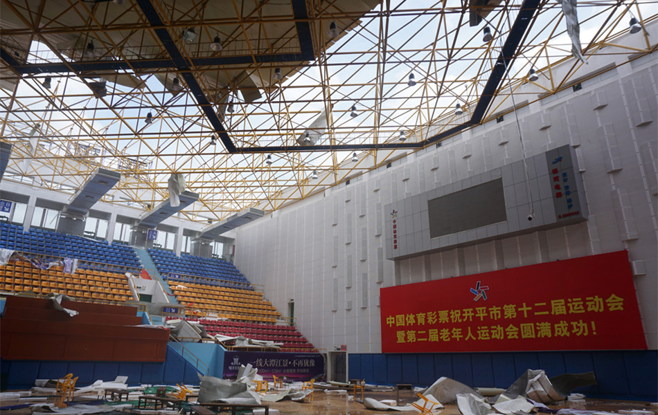 城区,市体育馆顶棚被强台风掀开,出现一个面积较大的“大洞”,馆内碎片散落一地。庞正华向市体育馆负责人了解体育馆出现这样的问题,是否会对正在进行的市运会产生影响。他要求先做好体育馆的清场隔离工作,没有维修好之前不要开放场馆,先确保安全,尽快恢复场馆的正常使用。