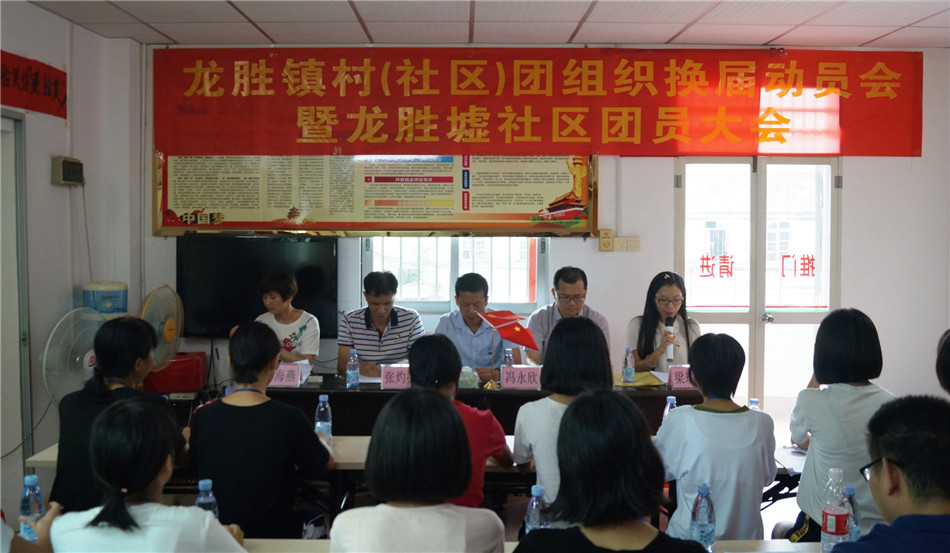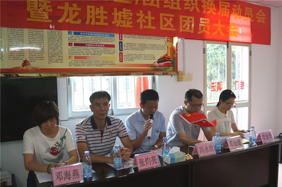 龙胜镇在龙胜墟社区会议室召开村(社区)团组织换届动员会暨龙胜墟社区团员大会。龙胜镇团委干部、龙胜墟社区团员代表、各村(社区)团组织负责人参加会议,龙胜镇党委委员、武装部部长冯永欣、镇党委委员邓灿耀、龙胜墟社区党支部书记张灼亮出席了会议并致辞。