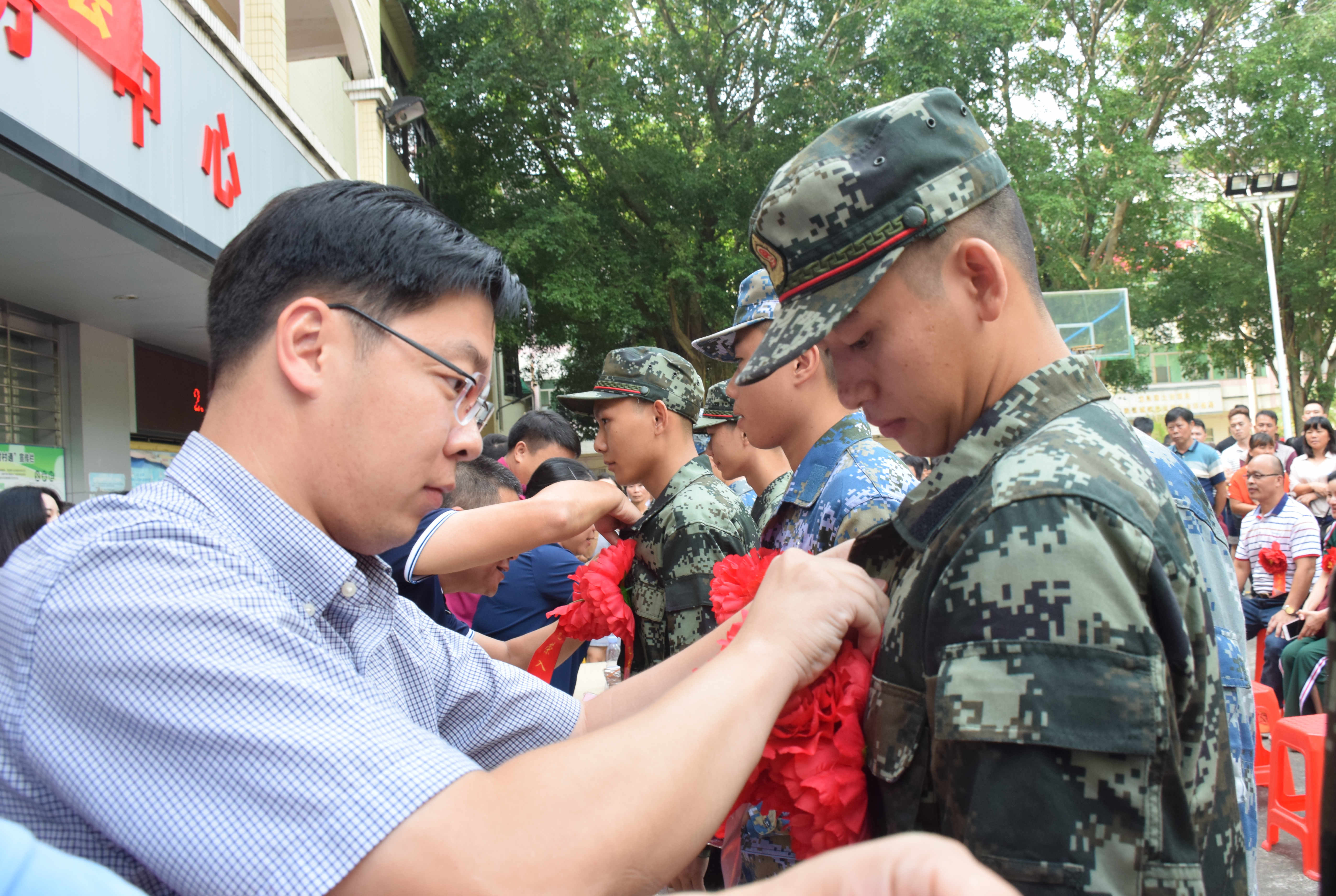 随后,谭晓华镇长等领导为14名入伍新兵佩戴鲜艳大红花,为他们送上纪念品,并叮嘱他们要服从部队安排,努力为家乡争光。最后,在锣鼓、鞭炮的齐鸣声中,新兵们带上亲人朋友的祝福踏上了服役征程。