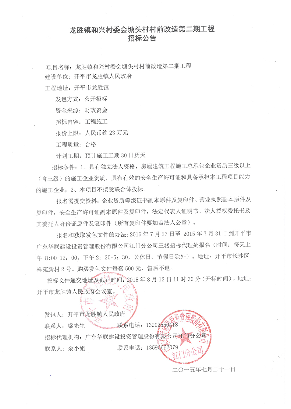 龙胜镇和兴村委会塘头村村前改造第二期工程招标公告