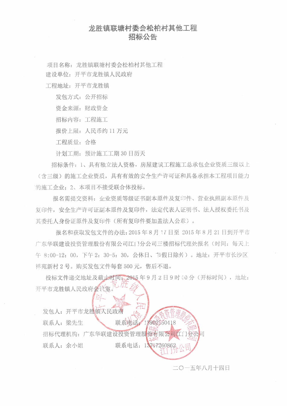龙胜镇联塘村委会松柏村其他工程招标公告