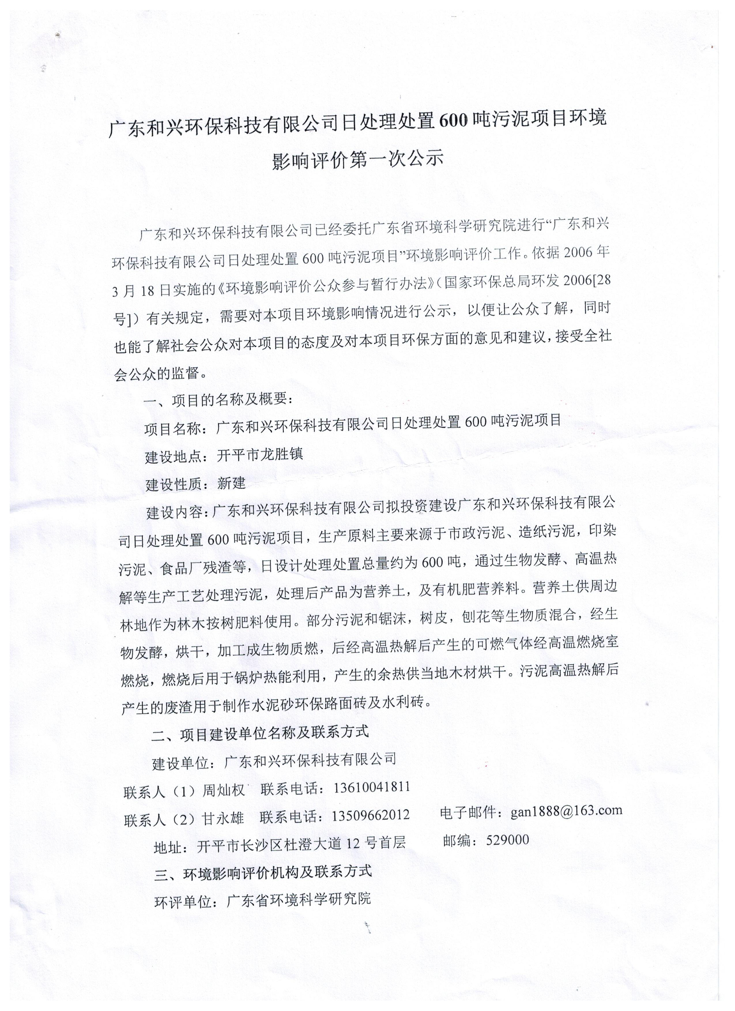 广东和兴环保科技有限公司日处理600吨污泥项目环境影响评价第一次公示