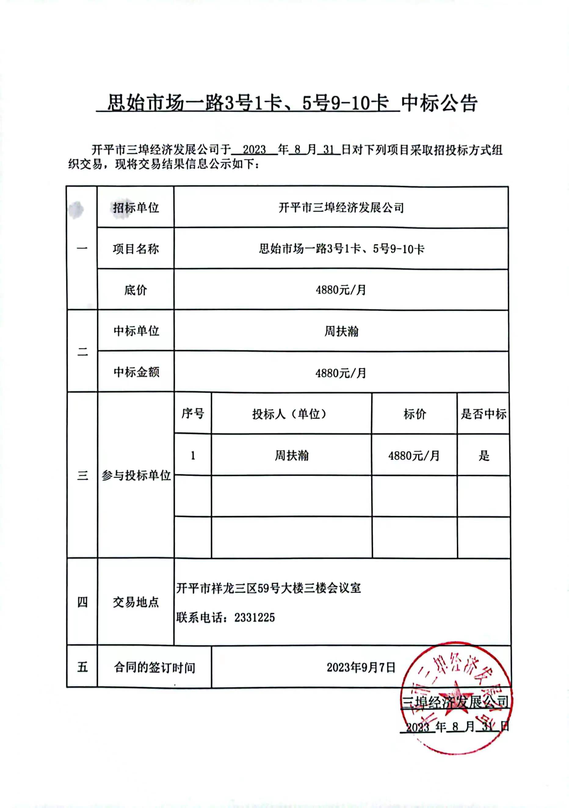 思始市场一路3号1卡、5号9-10卡中标公告