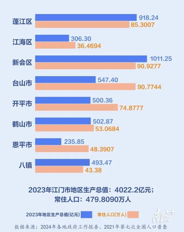 比如,八镇面积加起来是748.54平方公里,占全市的7.8%,比蓬江区(324.3)和江海区(109.16)要大2至7倍。又比如,八镇的常住人口有43.38万人,占全市的8.7%,与江海区、恩平市都相差不远。