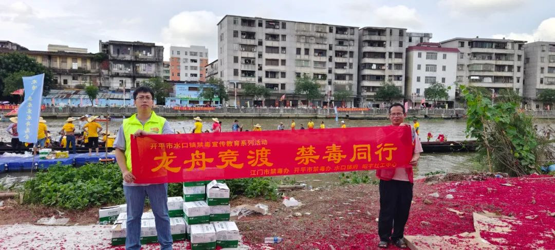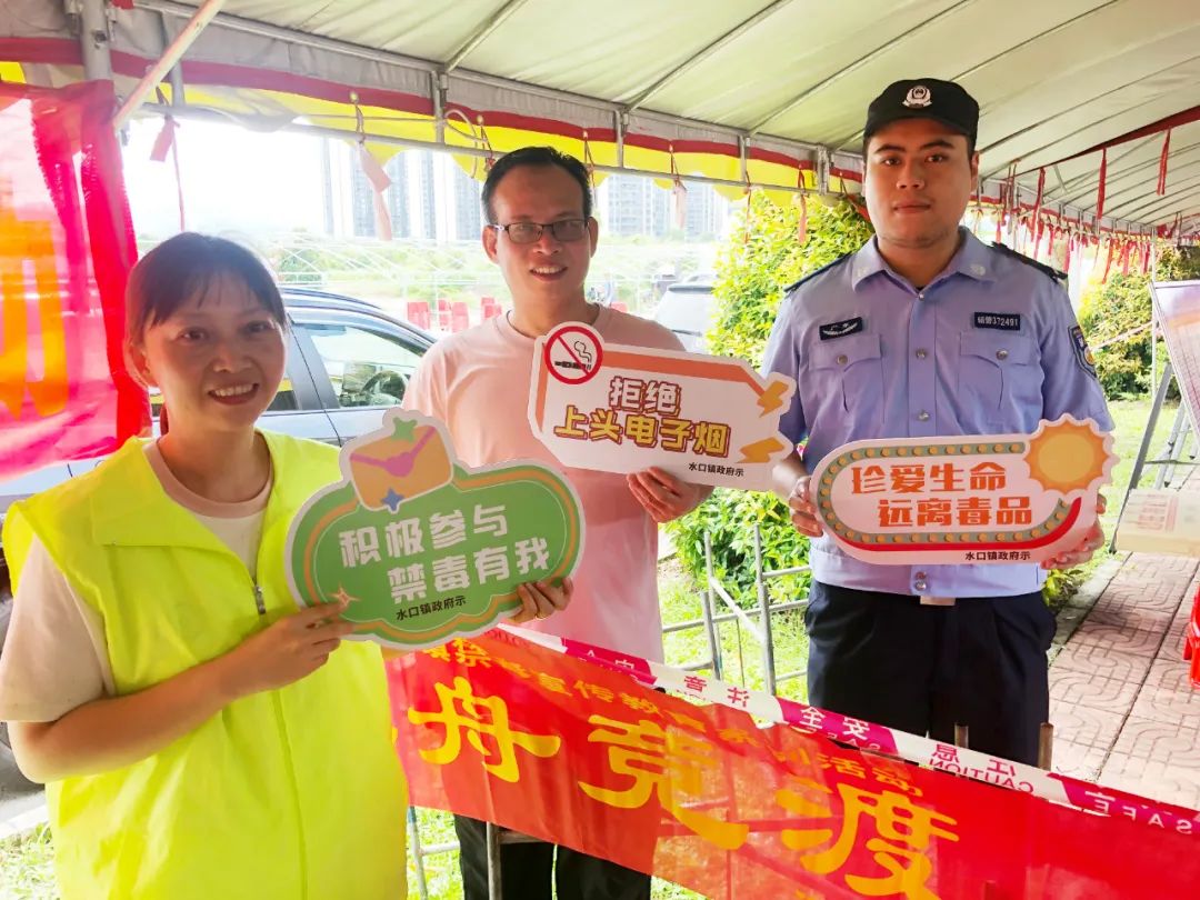 在保障龙舟活动顺利进行的同时,水口镇网格员充分利用节日热闹氛围,联合镇禁毒办、水口派出所、亚星官网 昭宇社会综合服务中心开展“龙舟竞渡,禁毒同行”禁毒主题宣传活动。