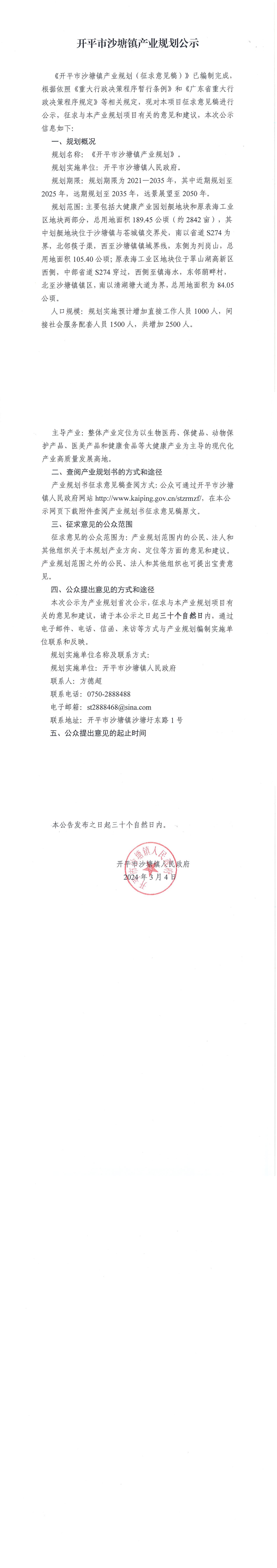 《亚星官网 沙塘镇产业规划(征求意见稿)》已编制完成,根据依照《重大行政决策程序暂行条例》和《广东省重大行政决策程序规定》等相关规定,现对本项目征求意见稿进行公示,征求与本产业规划项目有关的意见和建议,本次公示信息如下: