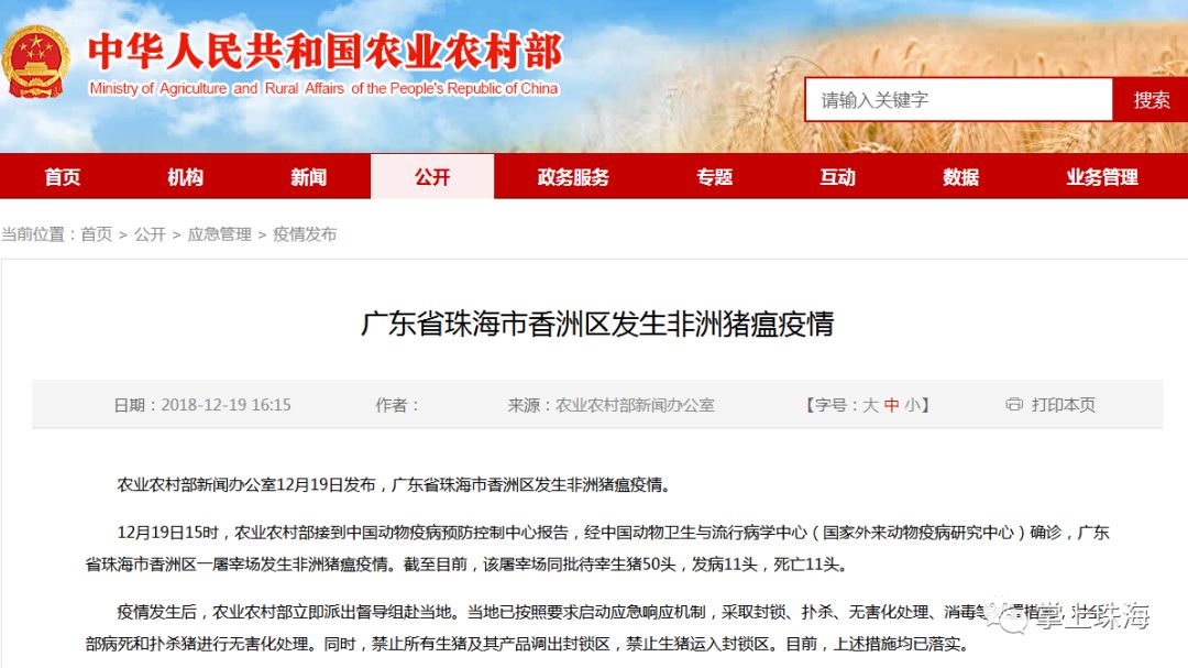 农业农村部新闻办公室12月19日发布消息称,广东省珠海市香洲区排查出一起非洲猪瘟疫情,截至目前,同批待宰生猪50头,发病11头,死亡11头。据悉,该疫情已得到有效处置,这是广东主动排查出的首例非洲猪瘟疫情。