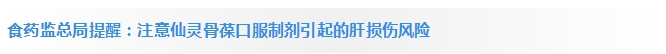 国家食品药品监督管理总局日前发布了第七十二期《药品不良反应信息通报》,提示关注仙灵骨葆口服制剂引起的肝损伤不良反应。食药监总局提醒:建议医务人员在使用仙灵骨葆口服制剂前应详细了解患者疾病史及用药史;患者用药期间应定期监测肝生化指标;药品生产企业应当加强药品不良反应监测。