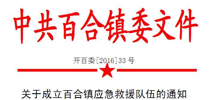 为进一步加强全镇应急救援队伍建设,提高突发事件应对处置能力,根据上级文件要求,结合我镇实际,经镇党委研究,决定成立百合镇应急救援队伍,具体事项通知如下: