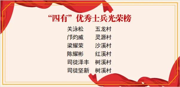 赤坎镇关泳松、司徒坚新等6位义务兵,在服役期间,牢记军人使命,凭借坚韧不拔的意志投身艰苦的训练中,在众多的战友中脱颖而出,荣膺“有灵魂、有本事、有血性、有品德”的“四有”优秀士兵称号,生动地展现了新时代革命军人的风采。