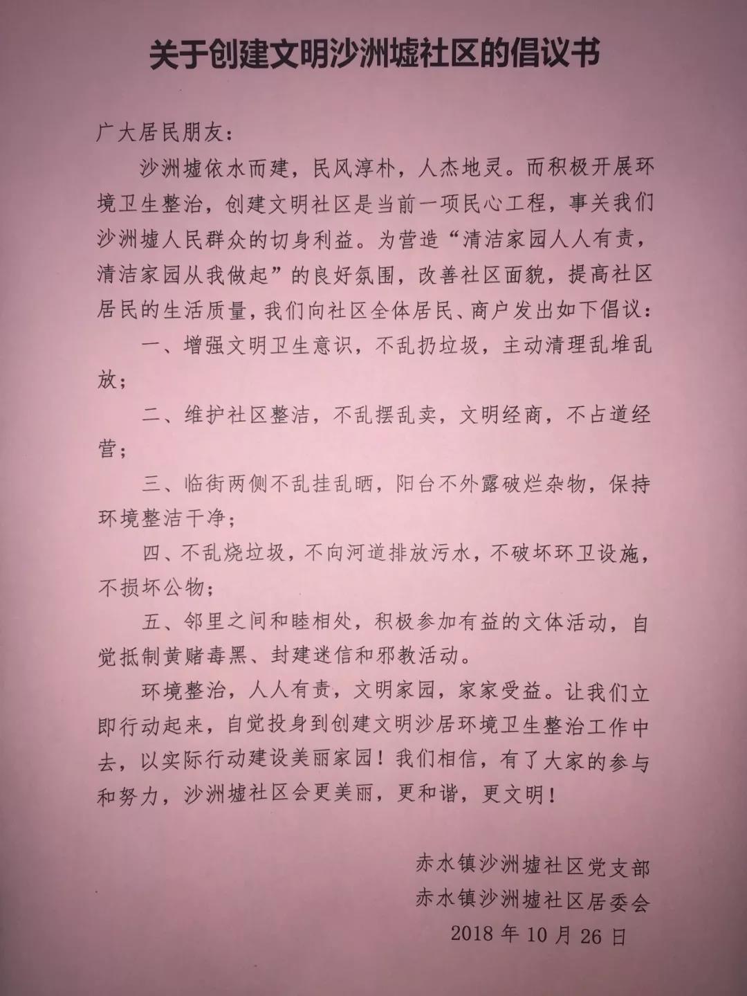 “近期我们社区的环境发生了大变化,路边的垃圾没了、蚊虫少了、通道畅通了,现在哪里都是整洁干净。”10月26日,赤水镇沙洲墟社区居民张女士说。”