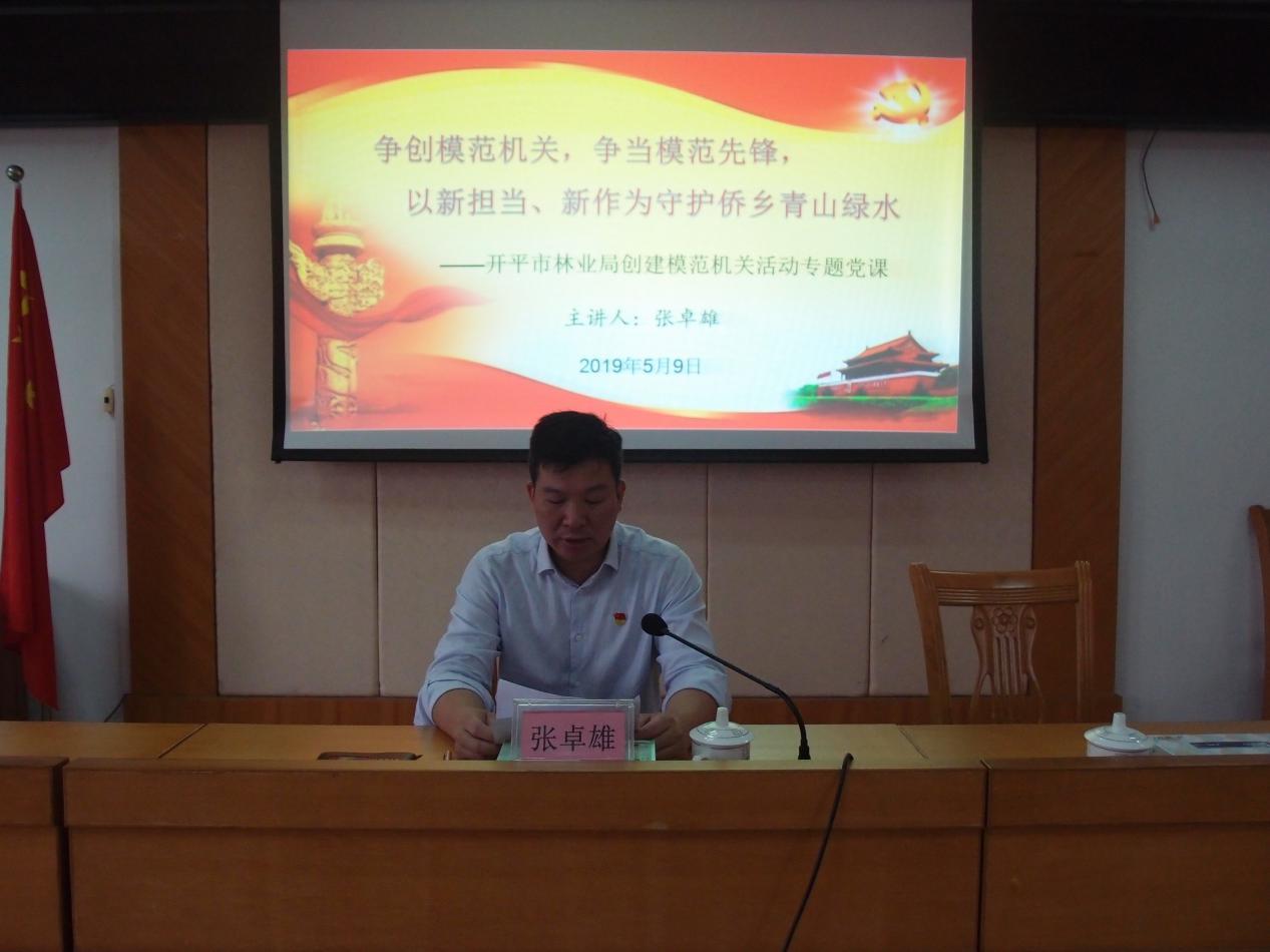 为深入推动模范机关创建活动扎实开展,5月9日,我局举办创建模范机关活动专题党课暨5月主题党日+活动。局机关(含森林分局及东山森林派出所)和孔雀湖国家湿地公园管理处、林科所党员干部以及东山、镇海林场班子成员、办公室主任共60多人聆听了宣讲。会议由局党组成员、副局长李雪清同志主持。 会上,张卓雄局长以《争创模范机关,争当模范先锋,以新担当、新作为守护侨乡青山绿水》为题,结合林业工作实际,紧密围绕“当好‘三个表率’、服务‘四个走在全国前列’”创建活动主题,为大家上了一堂生动精彩的专题党课,对我局争创模范机关,扎实促进林业生态文明建设,具有深刻的指导和推动作用。他就认真抓好我局创建模范机关活动提出了四方面意见:一是提高政治站位,充分认识加强党的政治建设、创建模范机关的重要性和必要性;二是突出政治建设,扎实构建风清气正的林业政治生态;三是积极主动作为,全力推进模范机关创建活动;四是立足服务大局,努力实现新时代新担当新作为。张卓雄局长强调,林业系统全体党员干部要积极参与模范机关创建活动,争当模范先锋,切实把我局打造成为让党放心、让人民群众满意的模范机关,以新担当、新作为守护侨乡青山绿水。