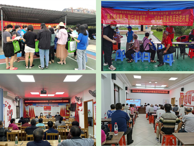 三是以活动提升诚信意识。发挥法治宣传教育优势,统筹基层司法行政工作者、普法志愿者、社会律师等法治力量,深入贯彻习近平法治思想,贯彻落实《中共中央关于印发〈法治中国建设规划(2020-2025年)〉的通知》精神,结合民法典、江门市文明行为促进条例等重点普法内容,推动广东省社会信用条例宣传工作融入法治乡村建设。其中,长沙司法所、苍城司法所和月山司法所分别组织开展形式多样的《广东省社会信用条例》主题宣传活动,普法志愿者们以社会受众需求为导向,以提升市场经营主体依法经营理念为着力点,向现场商户讲解宣传道德诚信及打假侵权等相关知识,强调诚信经营的重要性,引导树立诚信为本的观念,活动现场吸引了大批群众驻足学习了解。三埠司法所、赤水司法所邀请村居律师开展广东省社会信用条例专题普法课堂,特别面向老年人宣传建设诚信社会的重要性,仔细讲解打击整治养老诈骗相关的法律知识,以细心耐心的法律服务守护老年人“钱袋子”。通过村居律师的案例分析,深入浅出地讲解广东省社会信用条例相关的法律法规知识;从法律角度讲解守信激励和失信惩戒制度,不断提升人民群众的诚信意识。