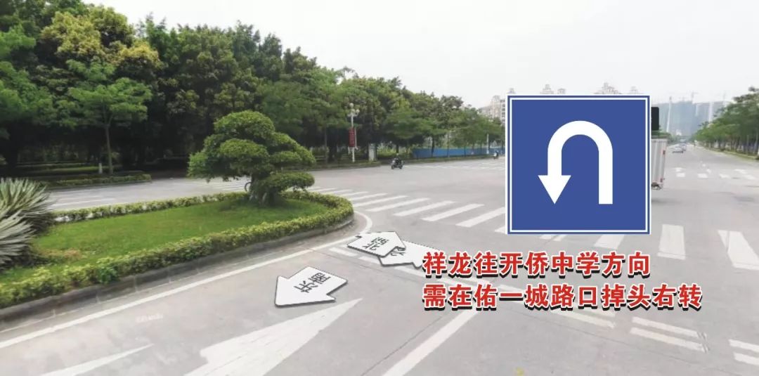 1、 南往北:祥龙桥往三江大道方向红绿灯两车道,绿灯时可直行右转,禁止左转,祥龙往开侨中学方向需直行到下一路口(佑一城路口)调头后右转;