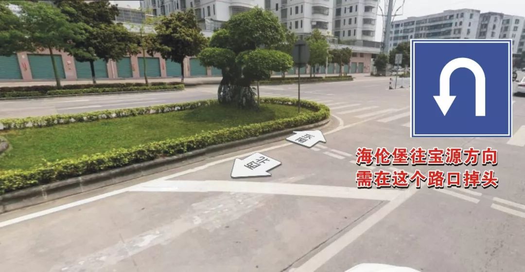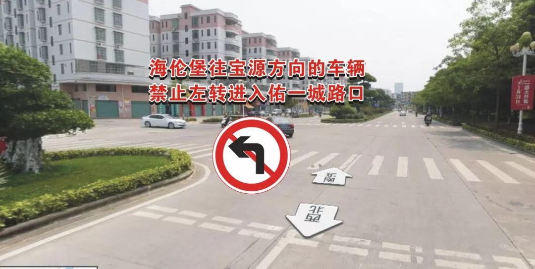 注意:①海伦堡往宝源方向的车辆禁止左转进入佑一城路口,需要往宝源方向的车辆请在下一路口掉头