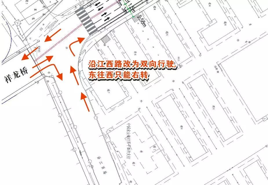 5、沿江西路往祥龙桥上桥路段:改为双向行驶,东往西只能右转。