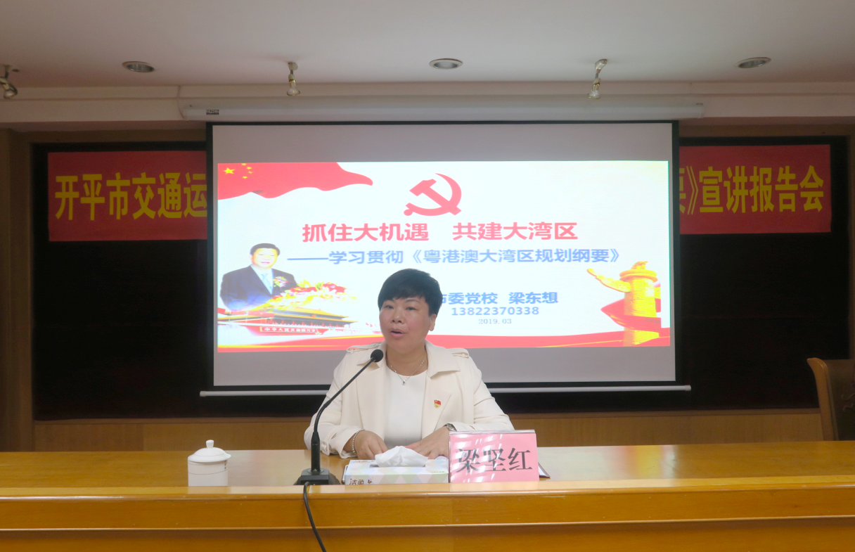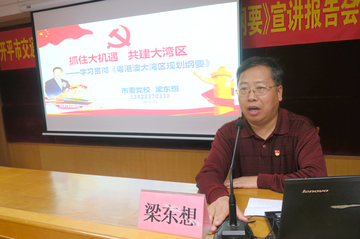为深入学习贯彻习近平总书记关于粤港澳大湾区建设重要论述和《粤港澳大湾区发展规划纲要》精神,切实把交通运输局广大干部职工的思想和行动统一到习近平总书记、党中央和广东省委、省政府的决策部署要求上来,根据市委宣传部的工作部署,市交通运输局结合工作实际,于4月1日上午举办了学习贯彻《粤港澳大湾区发展规划纲要》宣讲报告会,特别邀请了亚星官网 委党校校务委员梁东想同志作专题宣讲。市交通运输局领导班子成员、副主任科员、局机关各股室、综合执法局、直属单位全体干部职工,以及托管企业负责人共80多人参加了宣讲报告会。宣讲报告会由市交通运输局党组成员、副局长梁坚红同志主持。