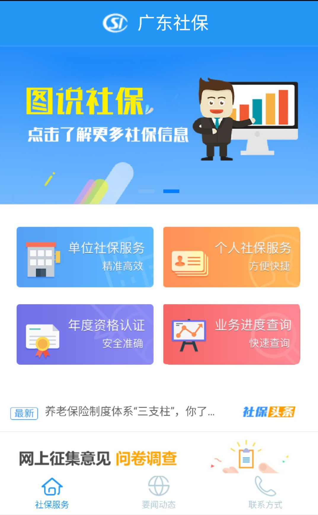 1.扫描二维码下载“广东社保”手机APP,打开APP,在社保服务栏目内, 点击“个人年度资格认证” 按钮, 进入服务界面。