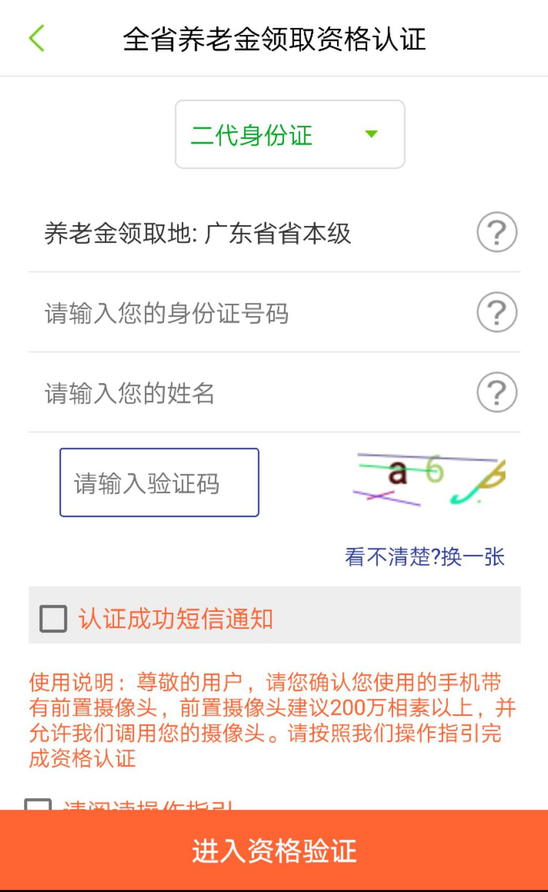 2.选择养老金领取地,输入二代身份证号码,姓名,验证码信息,阅读操作指引,阅读清楚后勾选确认,点击“进入资格认证” 按钮。如认证成功需要短信通知,请选择并填入手机号码。