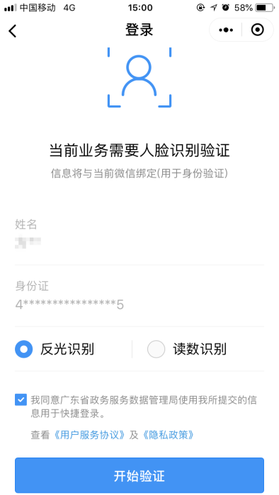 二、点击进入“养老保险”栏目下的“养老资格认证”菜单,选择“社保类型”,领取企业职工养老待遇的选择“城镇职工社保“,领取城乡养老待遇的选择“城乡居民社保”。选择“反光识别”或“读数识别”,勾选“我同意……及《隐私政策》”,点击“开始认证”。注意查看弹出的认证结果提示信息,确保认证成功。