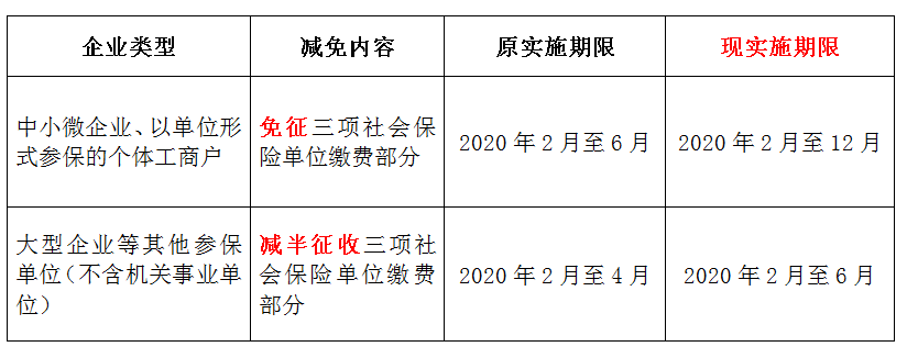 业务办理 延长阶段性减免企业三项社会保险费政策实施期限后,享受减免政策仍然实行“免填单、免申请”,符合条件的用人单位在申报社会保险费时自动享受单位缴费部分的减免。 享受免征三项社会保险费的 用人单位 对于中小微企业、以单位形式参保的个体工商户等享受免征三项社会保险单位缴费政策的用人单位,税务机关已经将减免期限截止日期由2020年6月30日调整为2020年12月31日。您只需按照原有的业务办理流程操作即可。 享受减半征收三项社会 保险费的用人单位 减半征收三项社会保险费政策在2020年4月就到期了,现在延长执行到6月底,那么已经缴纳2020年5月和6月社会保险费的是不是要办理退费呢?如果还没申报缴费,又该如何操作呢? 如果您已缴纳了2020年5月和6月的社保费,并已享受了减半征收的优惠,那么无需再办理结算。 如果您已申报但未缴纳社保费,系统已按规定自动减半计算应缴金额,无需作废已申报数据,核实无误后正常缴费即可。 如果您还未申报,那么也可以放心的申报缴费了,在申报时自动享受单位缴费部分的减免。 减半征收三项社会保险费政策将于2020年6月30日到期。自2020年7月1日起,大型企业等其他参保单位申报缴纳2020年7月所属期起(含7月)的社会保险费时,将不再享受减免优惠。用人单位应当按照政策规定,按时申报缴纳社会保险费。对受疫情影响不能按时缴费的,应当按原有做法正常办理增减员和申报,费款允许延期至疫情解除后三个月内补缴,补缴免收滞纳金。 人社部发〔2020〕49号文除了明确延长阶段性减免企业三项社会保险费政策实施期限外,还涉及缓缴社会保险费、2020年社会保险个人缴费基数上下限和灵活就业人员自愿暂缓缴费等规定。待我省的具体实施办法出台后,我们将第一时间通过“广东税务”微信公众号和广东税务门户网站“阶段性减免企业社保费”专栏做好宣传。