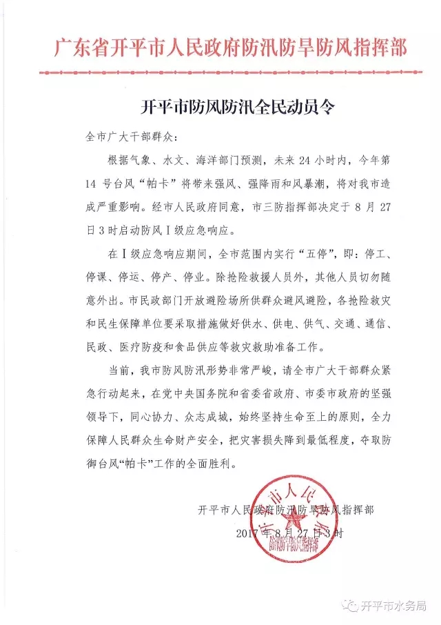 当前,我市防风防汛形势非常严峻,请全市广大干部群众紧急行动起来,在党中央国务院和省委省政府、市委市政府的坚强领导下,同心协力、众志成城,始终坚持生命至上的原则,全力保障人民群众生命财产安全,把灾害损失降到最低程度,夺取防御台风“帕卡”工作的全面胜利。