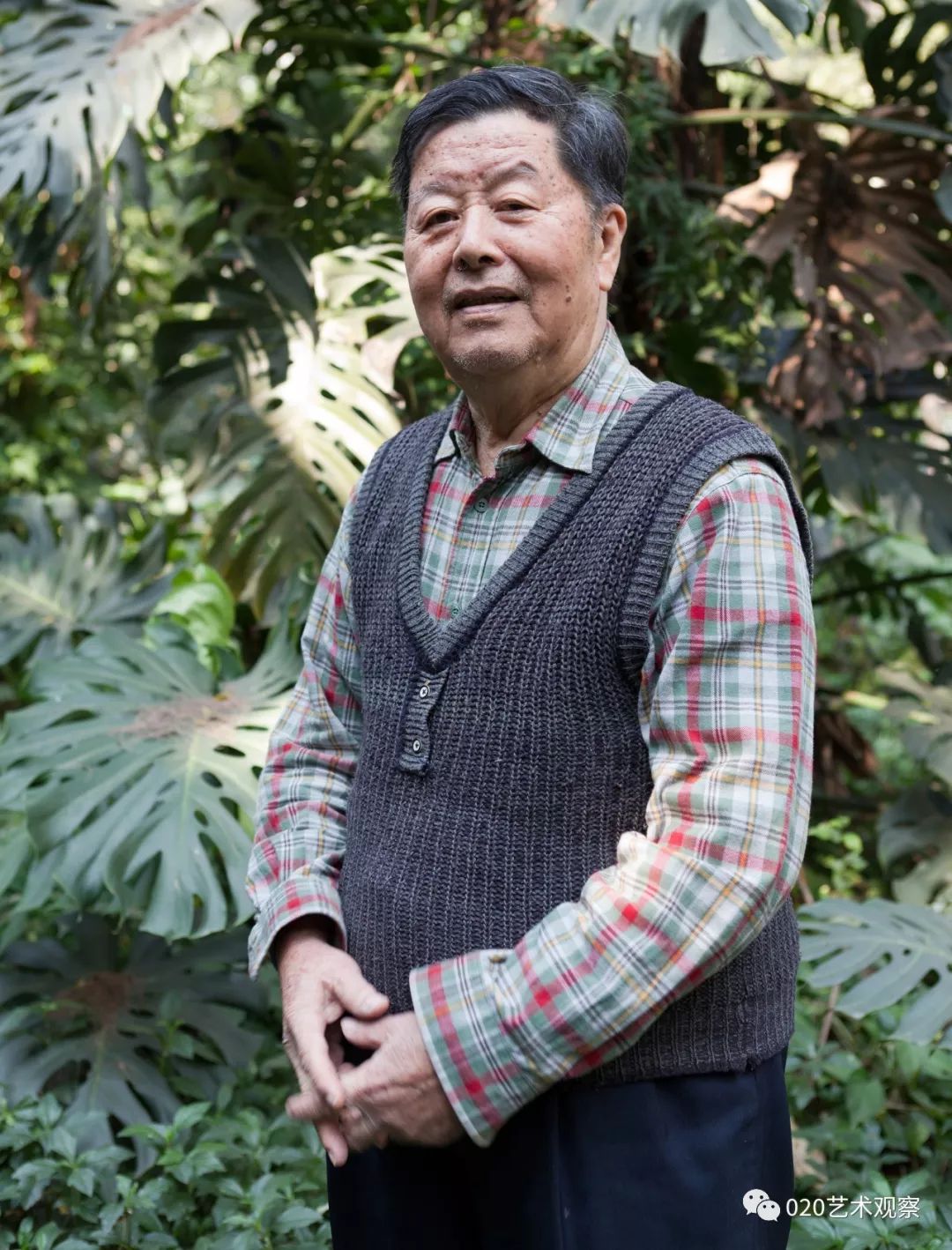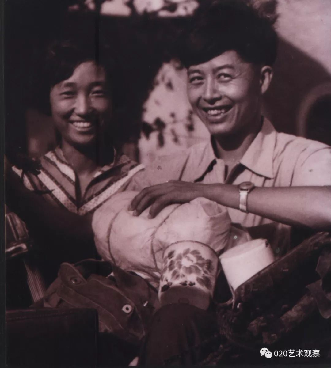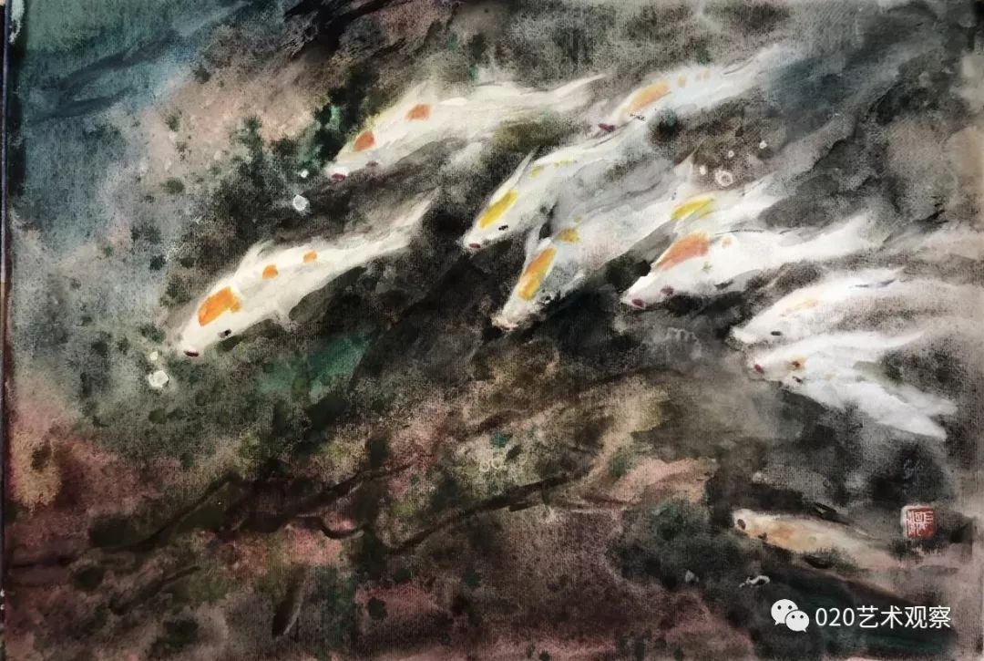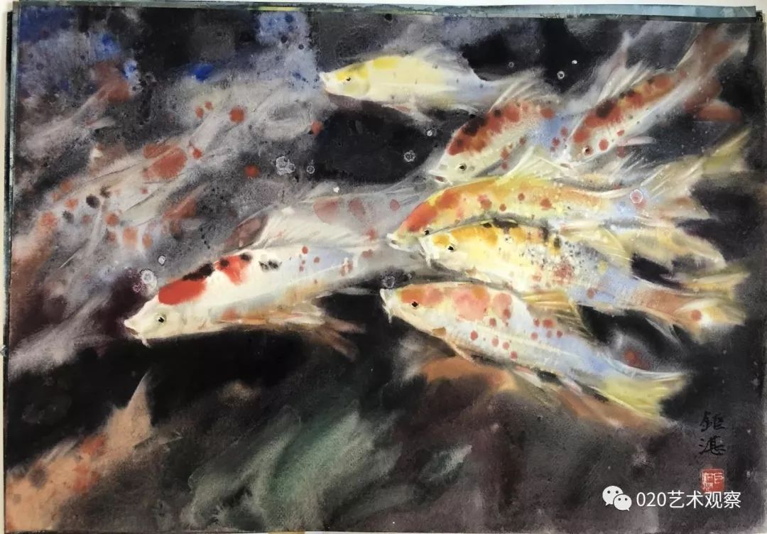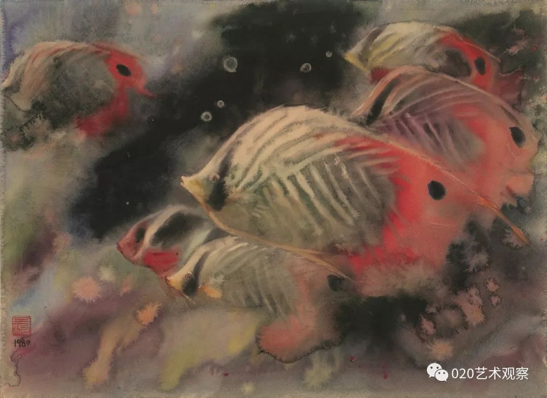 一中的时候),(胡根天)是我的老师。我那个时候,在学习这个阶段,没有人教也没有人说,我们都是自己动手动脚,自己在那里玩。我好多画都是动手实践出来的。如果搞不清楚、讲不清楚就动起来,慢慢就能感觉到是这么回事。后来才学会画画的,这整个过程我都是玩过来的。 采访中,胡钜湛老师长子胡赤骏老师向采访者展示胡赤骏早年学画期间曾用过的水彩颜料。龙成关摄 (胡赤骏补充)他说的意思大概就是那个时候只有在真实的生活里面玩,才有那种体验。他画风景、画鱼,都是在玩。他的意思就是说要接触真实的生活。 热带鱼 水彩 39cm×54cm 1980年 “鱼跟我们有感情” 我觉得鱼跟我们有感情,鱼可以帮我们想很多东西,鱼动起来,很多变化是你想不到的。会引起共鸣,跟人的心有联系。鱼在水里玩啊玩啊,靠水来表现,水有多少,出来的效果都不一样。鱼比较活跃,容易表现出来。画鱼,有光线就显得很丰富,好多人都体会不到。要掌握这个水的性能和光线,要做到心中有数,要让水听你的话,听你“指挥”。我可以利用这个光线的变化,表现色彩什么时候浅,什么时候深。画鱼时,有些时候是在水上面做功夫,有些时候是在水的表现上,它们的效果是不同的。 1958年胡钜湛与陈秀莪在武汉中南美专结婚,婚后因为学校工作安排,胡钜湛随学校去广州参与组建广州美术学院,陈秀莪赶回湖北珠基农场 艺术伉俪 (胡赤骏讲述)他们(胡钜湛和陈秀莪)画画主要分三种类型:一个是习作,习作一般给学生示范画的,是有对象的一种画法;再一个就是他们带学生下乡写生,我觉得他们当时下乡写生是很自在的,画了很多很漂亮的作品;然后,就进入到后来那个阶段,他们自己慢慢摸索到了一个题材,一些做法。像我母亲,她就是以花为主,画花。他们两人都画鱼,两个人在技法上有切磋,互相都有一些“小发明”。比方说,他的画里面鱼的那种气泡,是我母亲发明的。她用酒精滴在画作上,然后产生了像气泡一样的那种感觉,他就用上了,他们在技法上相互借用,但题材不一样。 教学示范 组创广美教育系 (胡赤骏讲述)他(胡钜湛)是(20世纪)80年代末去组创广州美院教育系的,以前叫师范系,培养专门的美术老师。他去做了三次调研,都有详细的笔记。第一次是全国素描研讨会的调研,第二次是为了师范教育的调研。后来就是为了水彩教育,水彩这个专业的教学记录。这三次都有很详细的笔录,最后就成立了这个师范系。这个师范专业在当时是全国第一个正式的水彩教育专业,他也是第一个在全国招水彩专业研究生的人。 教学 “三小时作画” 以前和现在肯定是有变化的,都不一样。比如有些东西用来表现鱼可以,但是表现别的就不行。如果画的是很结实的东西,比如金属,它就没办法体现。有些画法只适合一种题材,总不能说让所有人都去画鱼。平常画水彩要想很多办法来表现水的变化,材料的变化也多种多样。平常画一张画要画三小时,但我画的时间就可以比较短。 我们拜访颜文粱老师 (胡赤骏讲述)他所说的“三个小时”,指的是一张纸弄湿了以后,基本上三个小时就会干了。纸干了以后你再画,它就生硬了,就会出现硬边,很生硬的感觉。所以他要在三小时没干之前,让颜色都能融在一起。 写生 我观察过他画画,现在这个时候是他画画最好的时候,因为湿度大。下大雨,湿度就很大,他这个时候画画成功率就很高。因为画纸干的时间相对比较长,他有更多的时间去调整,所以这个画和天气有很大关系。 水彩画研究会 我做过实验,请他去“湖庐”,正好那个时候是北风天,他要画一个东西他就画不了,因为那个画干得太快,所有东西他都操控不了。他画画是会受到客观环境的影响的。我曾经想跟他在从化搞一个画室,按照他要求的光线,那个空间里面可以控控制干湿度。曾经设想过,但是没有做成。 北京展览 1986年我在西双版纳写生 鱼水情 水彩 54cm×79cm 1984年 族群 水彩 54×79cm 1997年 幽兰 水彩 39.7×54cm 1980年 黄斑鱼 水彩 39.5×55cm 1982年 气象万千 水彩 54×79cm 2014年 如鱼得水 水彩 54×79cm 2015年
