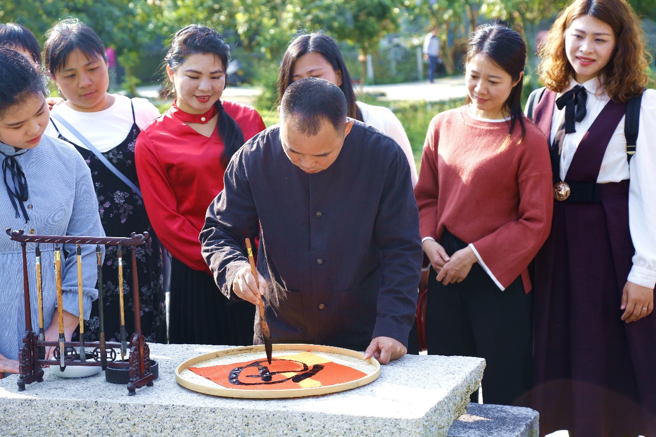原来是有书法家在广场中央挥毫