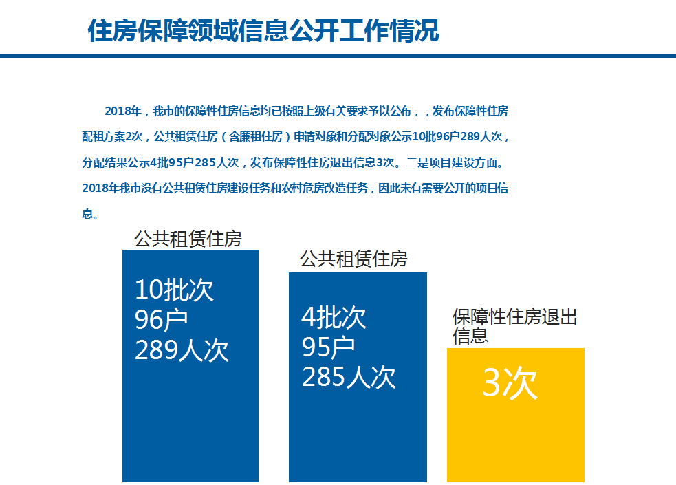 分配结果公示4批95户285人次,发布保障性住房退出信息3次。二是项目建设方面。2018年我市没有公共租赁住房建设任务和农村危房改造任务,因此未有需要公开的项目信息。