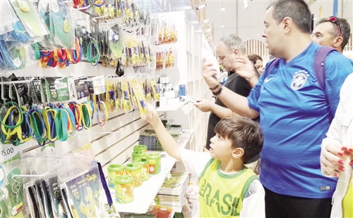 奥运会纪念品商店里,人们选购里约奥运会吉祥物“维尼修斯”。翻开它的标签,能清晰地看到由葡萄牙语书写的“中国制造”。徐惠喜 摄