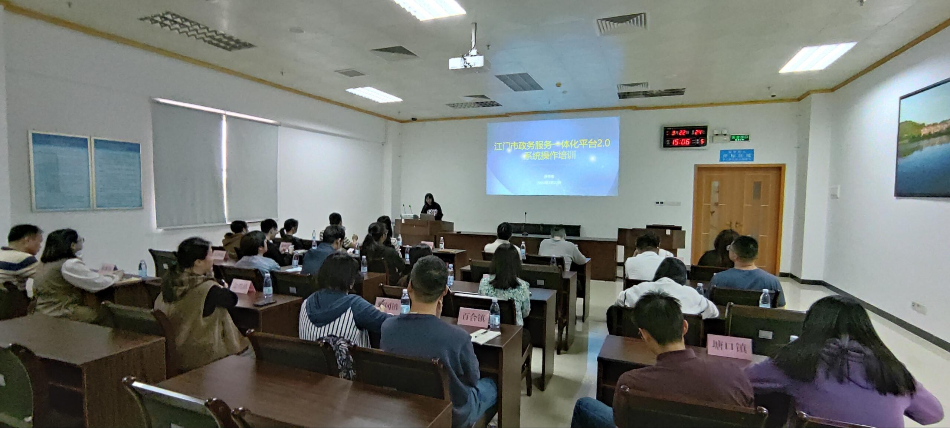 的工程师进行授课,内容包括一体化平台V2.0审批业务流程、审批模块介绍、系统操作指引、审批常见问题等四方面,并与参训人员进行现场互动,答疑解惑。 通过培训交流,使窗口审批人员对江门市政务服务一体化平台V2.0有了更深一步的认识,对提升日常的业务操作能力打下坚实基础。 建设江门市政务中台和政务服务一体化平台V2.0,是落实国家、省提升“一网通办”能力,“高效办成一件事”等工作部署,以标准化统筹政务服务渠道和推动线上线下协同服务的重要举措,是优化政务服务、提升行政效能的重要抓手。市政数局要求我市各级实体办事大厅对此要有充分的认识,并结合工作实际,坚持贯彻上级“标准规范、四级统一”的工作要求,推动综合服务窗口受理业务“全线办、进中台、统一办”,同时要及时反馈实际使用中遇到的难点、堵点问题,协力促进系统平台功能完善优化,稳步提升基层政务服务线下服务能力,为我市深入实施“百县千镇万村高质量发展工程”贡献一份力量。