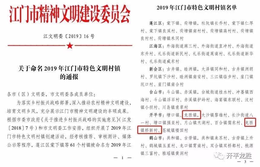 近日,江门市委、市政府印发《关于命名2019年江门市特色文明村镇的通报》(江文明委〔2019〕16号),龙胜镇及龙胜镇桥新村分别荣获“江门市文明镇”、“江门市文明村”称号。