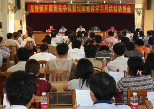 动员会现场 7月20日,龙胜镇召开深入开展创先争优暨纪律教育学习月活动动员会。镇机关干部职工、村(居)委会干部以及站所负责人等170多人参加了会议。 张拓天镇长主持会议 会议由镇长张拓天主持。镇党委委员林文烈就全镇基层党组织和党员深入开展创先争优活动进行了全面部署,明确了创先争优活动的指导思想、总体要求、主要内容、时间安排、方法步骤及组织领导等六个方面内容。本次活动历时两年时间,分为动员部署、全面争创、扎实推进、总结提升四个阶段进行。 镇纪委书记苏学东对全镇开展纪律教育学习月活动作具体部署,要求各单位要把经常性教育与集中教育结合起来,紧紧围绕“加强制度教育,构建拒腐防线”的主题,坚持“教育在前、防范在前、关口前移”的方针,以领导干部为重点对象,以人生观、价值观为教育核心,以制度建设为重要保障,切实把纪律教育学习月活动落到实处。加强对党员干部的党性党风党纪教育,树立正确政绩观、利益观和权力观,增强立党为公、执政为民、依法执政、廉洁从政的自觉性。 镇党委书记冯健楚同志作动员报告 镇党委书记冯健楚在动员讲话中指出,要充分认识深入开展创先争优活动的重大意义,明确“推动科学发展、促进社会和谐、服务人民群众、加强基层组织”的总要求,把握“创建先进基层党组织、争当优秀共产党员”的工作重点,在全镇基层党组织和党员中深入开展创先争优活动。要立足镇情,提高认识,增强纪律教育学习的紧迫感和责任感,把握关键,扎实开展纪律教育学习月活动。要把加强纪律教育与反腐倡廉结合起来,不断增强党员干部的党纪政纪和法治意识,提高党员干部的拒腐防变能力,保证党员队伍的纯洁性和先进性。会议要求各单位要加强组织领导,落实责任,把创先争优活动和纪律教育学习月活动抓实抓好、抓出成效。 随后,镇党委副书记朱乔传达了市委组织部“三推两评”选拔领导干部会议精神,布置干部推荐工作。